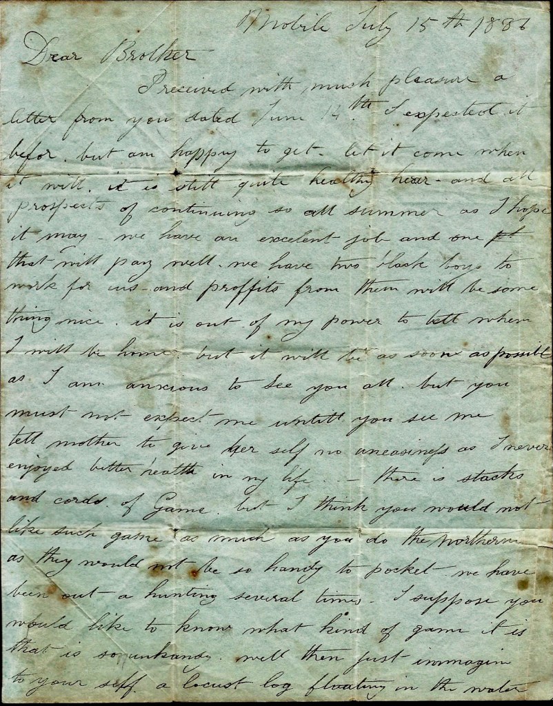 Dear brother Ezra, …I am staying in the City of Mobile guarding tools and we are having good times but I don’t know how long we will have to stay here. The Brigade is out of town three miles and also the rest of the Pioneer Corps and there is twelve of us here guarding the tools. But I begin to think that we will come home in a short time if we don’t have to go to Texas….