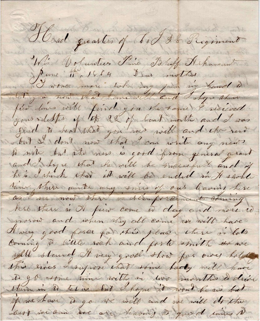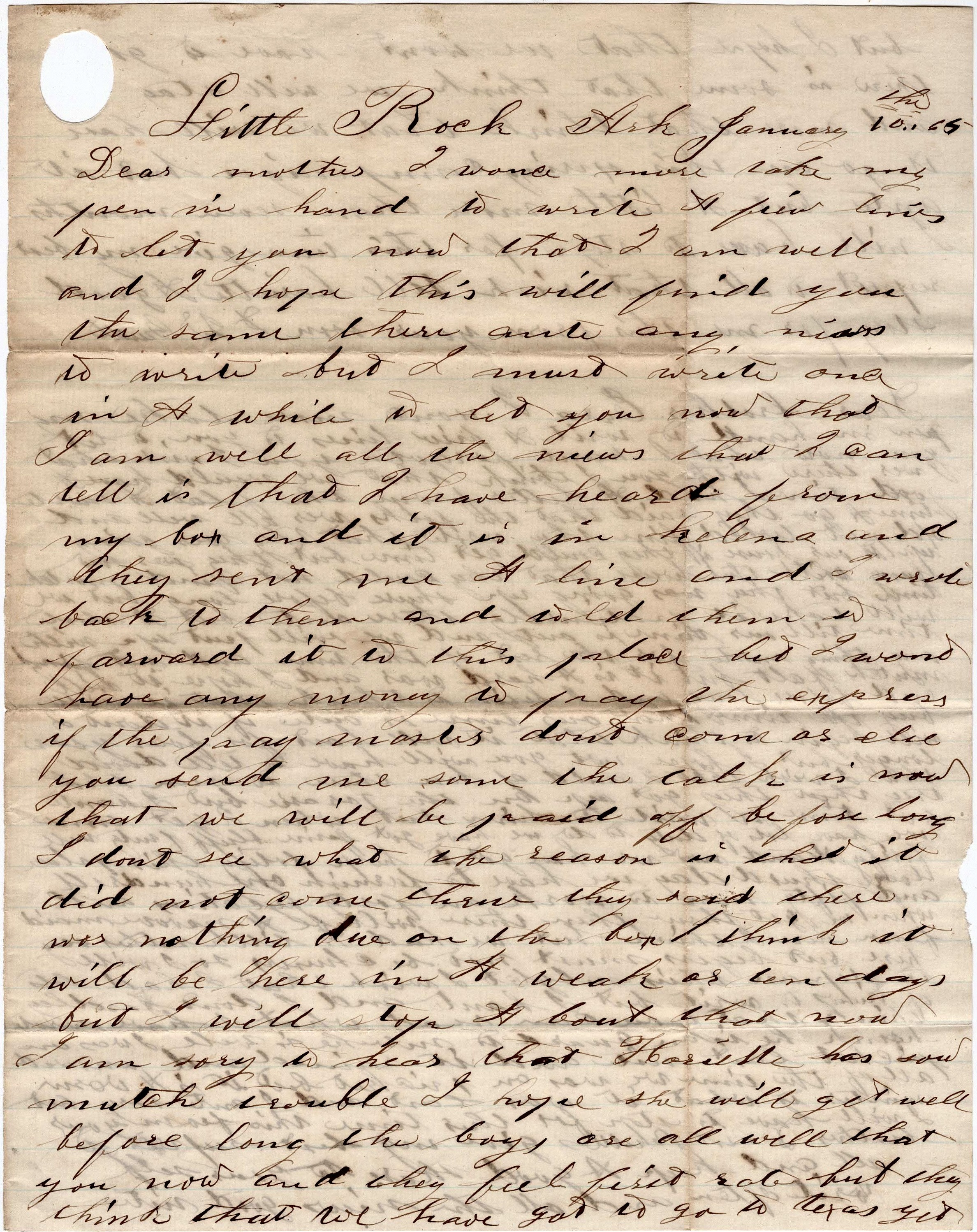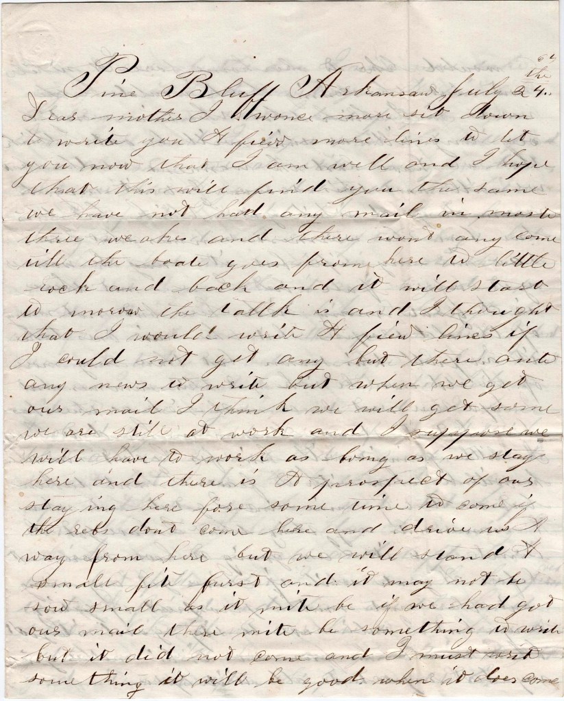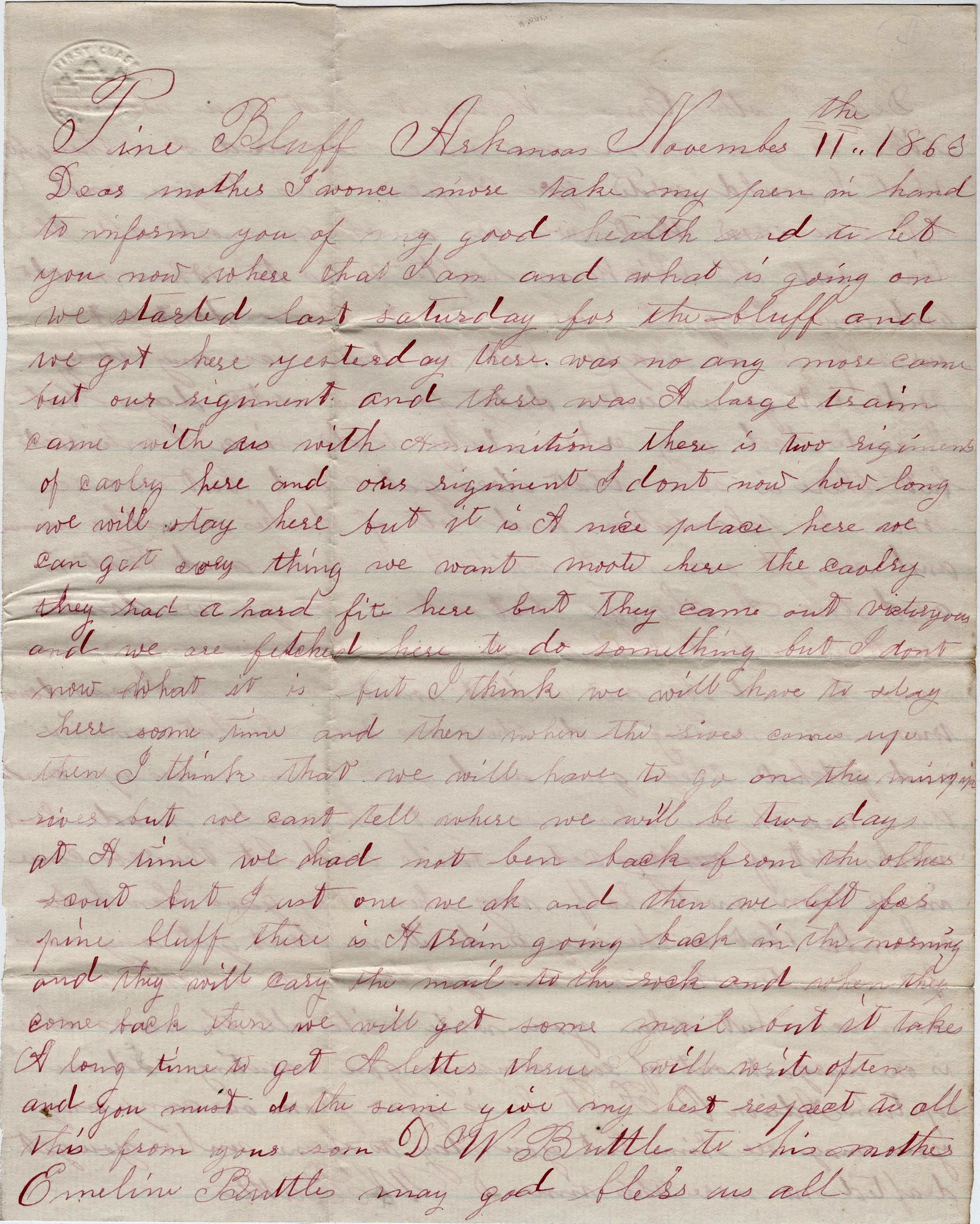I once more take my pen in hand to inform you of my good health and to let you know where that I am and what is going on. We started last Saturday for the Bluff and we got and we got here yesterday. There was not any more came but our regiment and there was a large train came with us with ammunitions. There is two regiments of cavalry [5th Kansas Cavalry and 1st Indiana Cavalry] here and our regiment. I don’t know how long we will stay here but it is a nice place here. We can get everything we want here. The cavalry they had a hard fight here but they came out victorious and we are fetched here to do something but I don’t know what it is but I think we will have to stay here some time. And then when the river comes up, then I think that we will have to go on the Mississippi River. But we can’t tell where we will be two days at a time. We had not been back from the other scout but just one week and then we left for Pine Bluff. There is atrain going back in the morning and they will carry the mail to the Rock and when they come back, then we will get some mail. But it takes a long time to get a letter through. Will write often and you must do the same. Give my best respects to all. This from your son, — D. W. Buttles