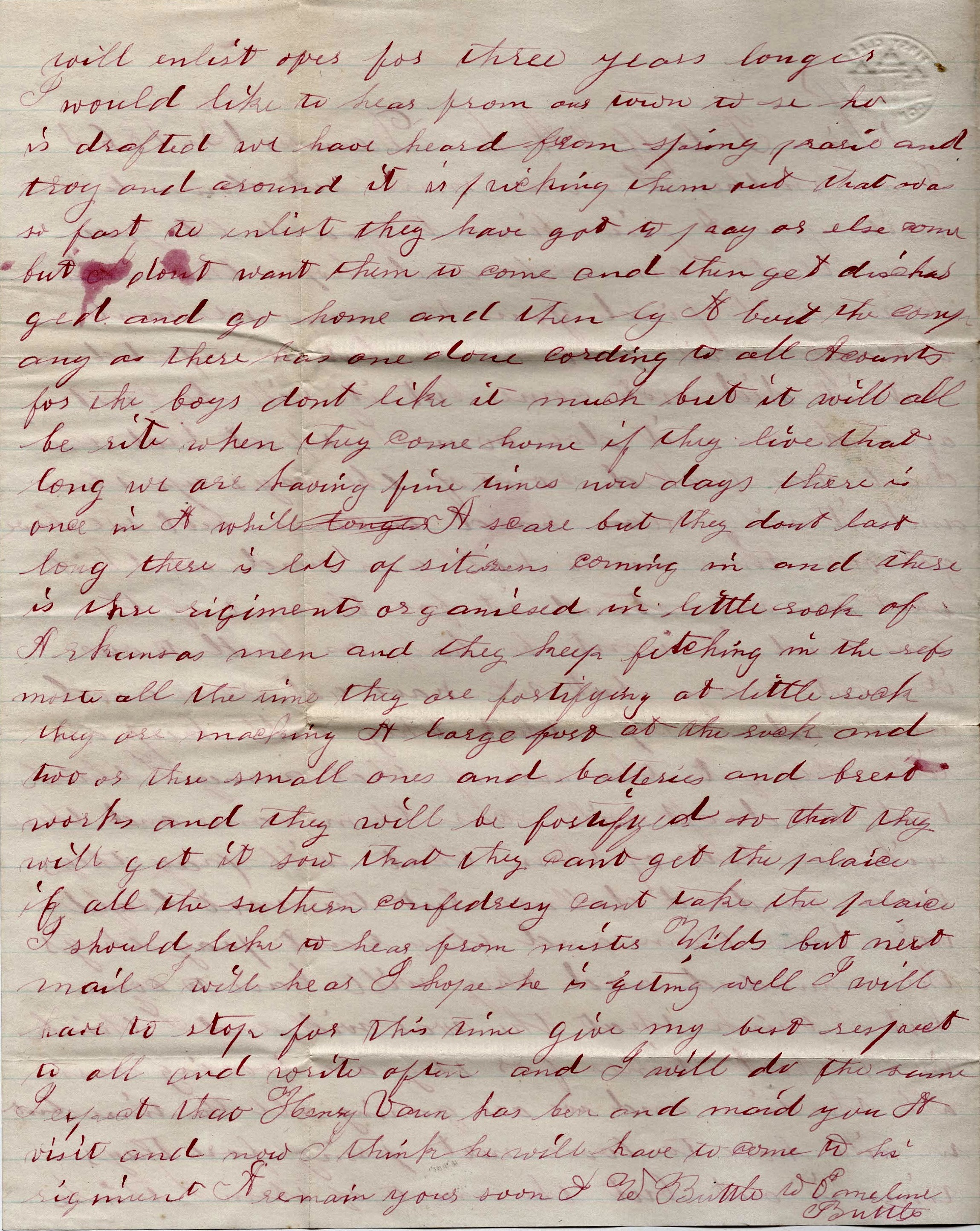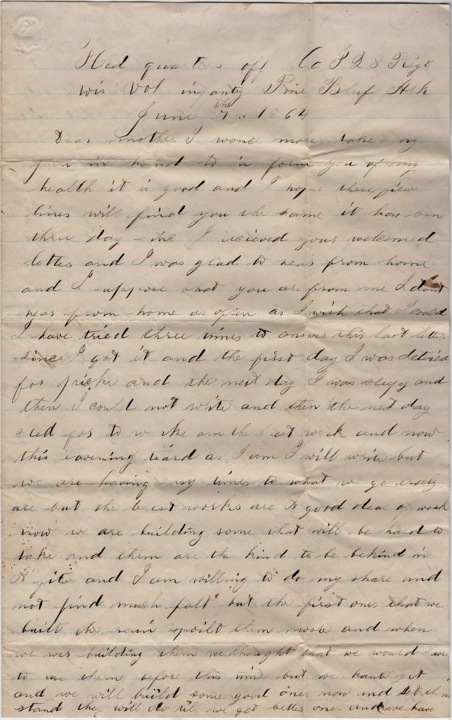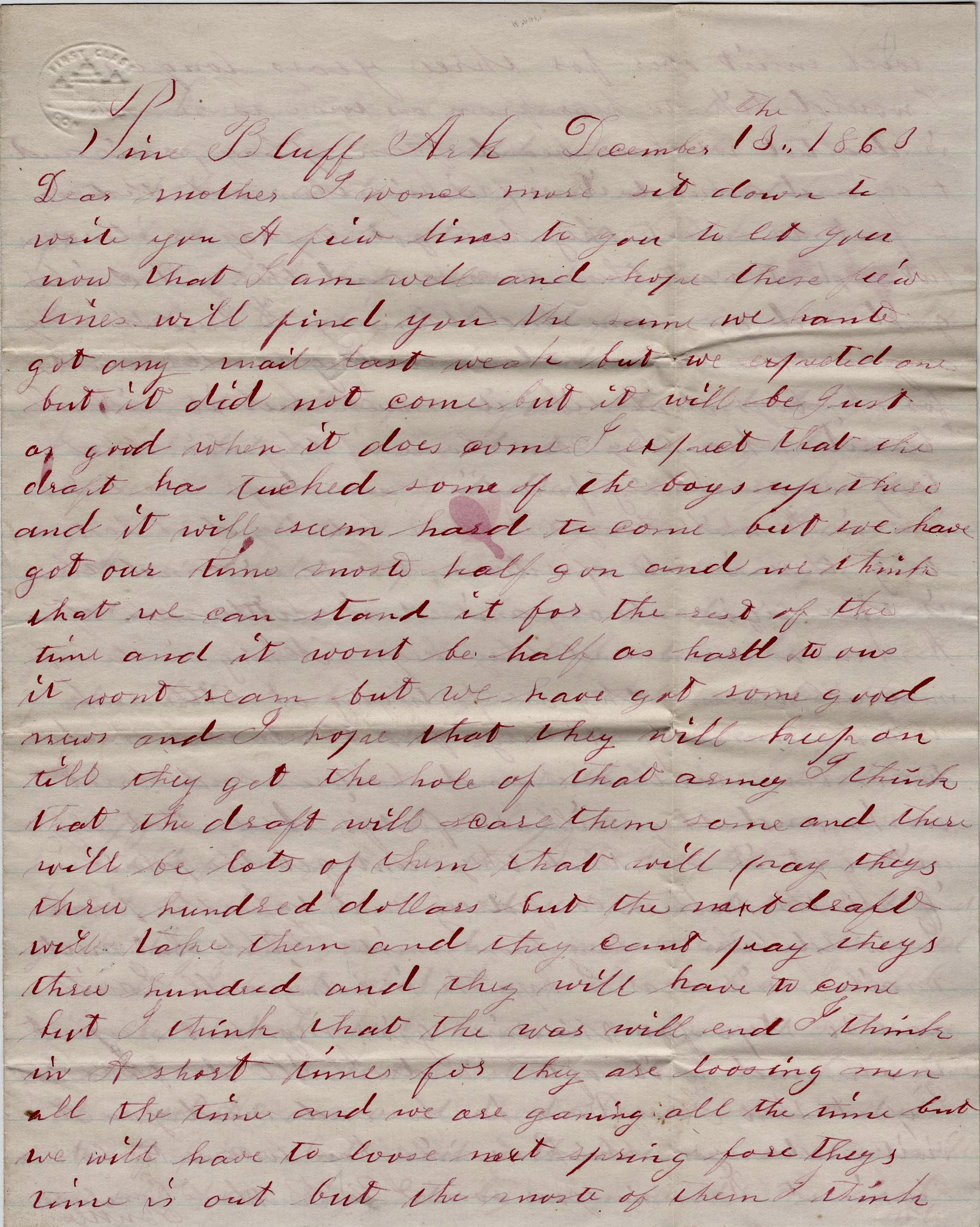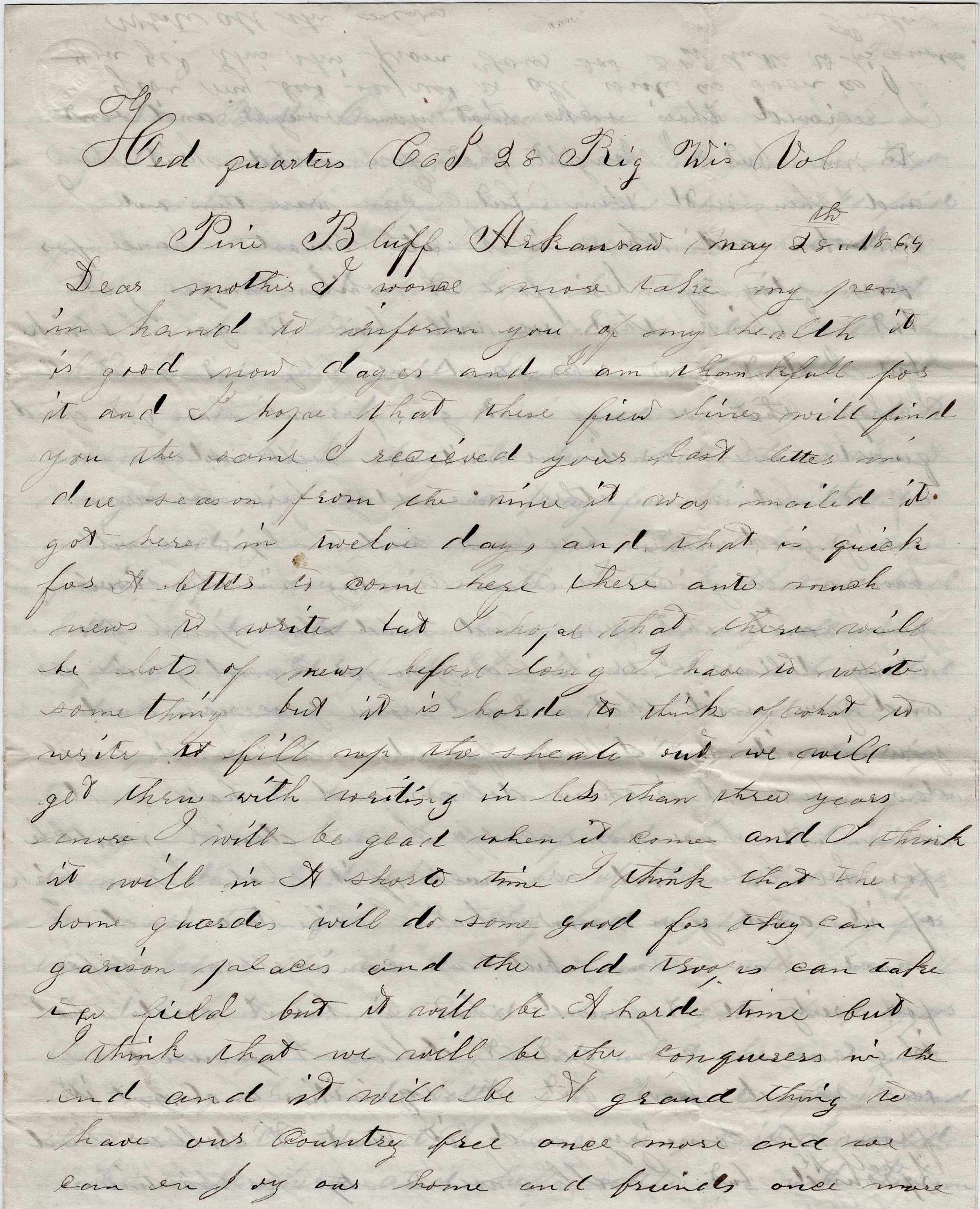 I once more take my pen in hand to inform you of my good health and to let you know where that I am and what is going on. We started last Saturday for the Bluff and we got and we got here yesterday. There was not any more came but our regiment and there was a large train came with us with ammunitions. There is two regiments of cavalry [5th Kansas Cavalry and 1st Indiana Cavalry] here and our regiment. I don’t know how long we will stay here but it is a nice place here. We can get everything we want here. The cavalry they had a hard fight here but they came out victorious and we are fetched here to do something but I don’t know what it is but I think we will have to stay here some time. And then when the river comes up, then I think that we will have to go on the Mississippi River. But we can’t tell where we will be two days at a time. We had not been back from the other scout but just one week and then we left for Pine Bluff. There is atrain going back in the morning and they will carry the mail to the Rock and when they come back, then we will get some mail. But it takes a long time to get a letter through. Will write often and you must do the same. Give my best respects to all. This from your son, — D. W. Buttles