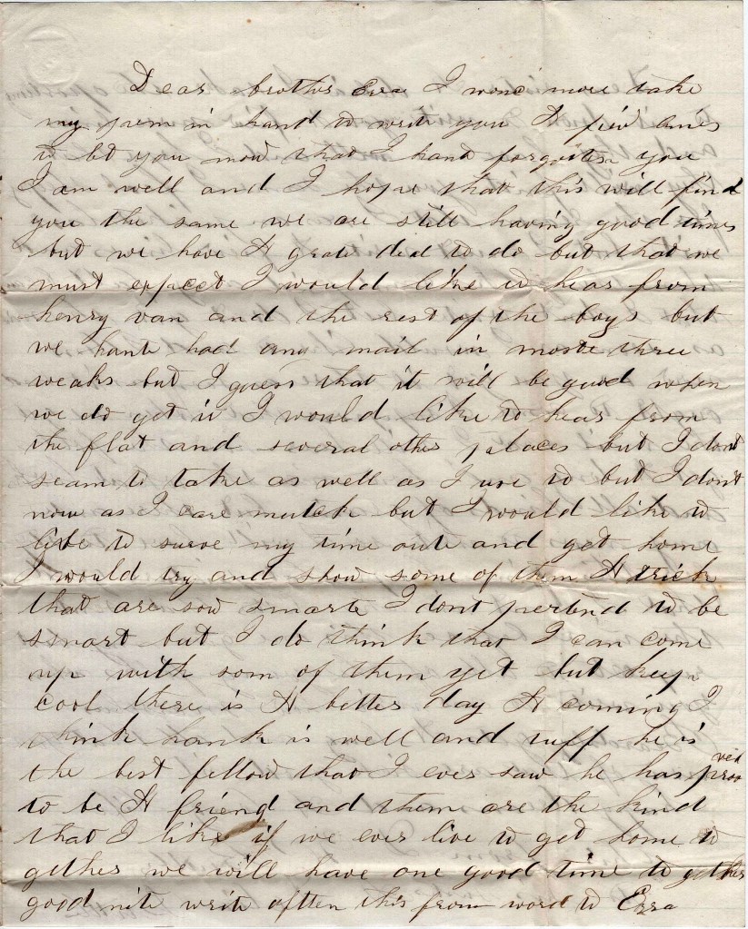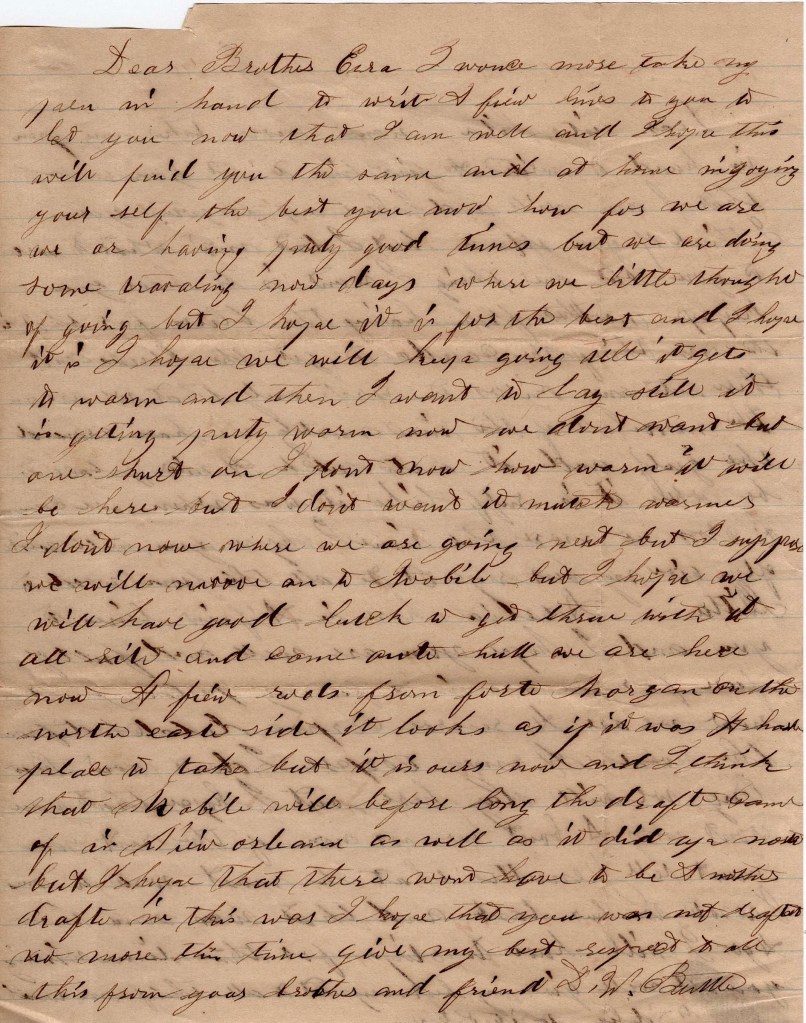 Dear brother Ezra, I once more take my pen in hand to write a few lines to you to let you know that I am well and I hope this will find you the same and at home enjoying yourself the best you know how for we are having pretty good times. But we are ddoing some traveling now days where we little thought of going. But I hope it is for the best and I hope we will keep going till it gets too warm and then I want to lay still. It is getting pretty war, and we don’t want but one shirt on. I don’t know how warm it will be here but I don’t want it much warmer. I don’t know where we are going next but I suppose we will move on to Mobile. But I hope we will have good luck to get through with it all right and come out whole. We are here now a few rods from Fort Morgan on the northeast side. It looks as if it was a hard place to take but it is ours now and I think that Mobile will before long.