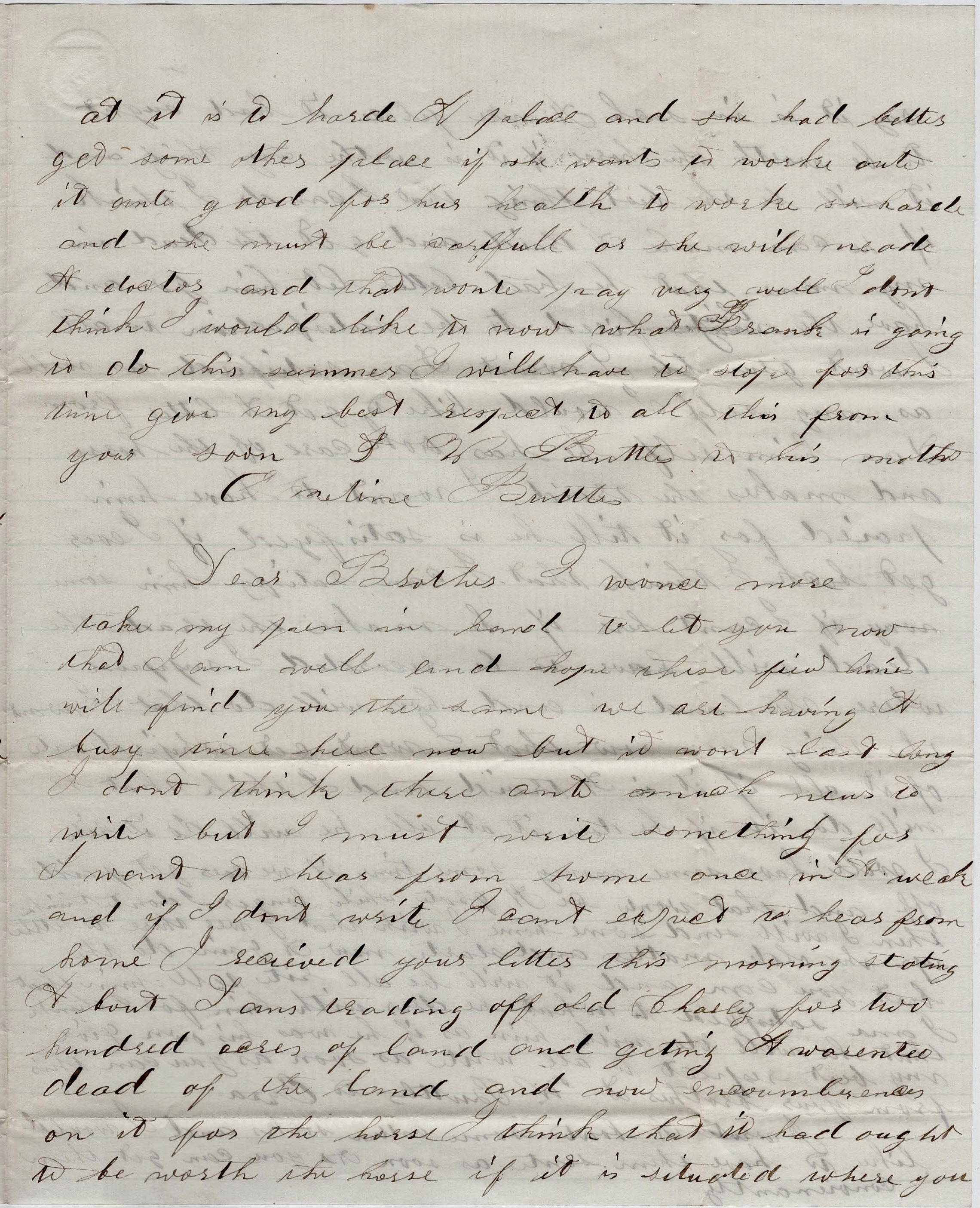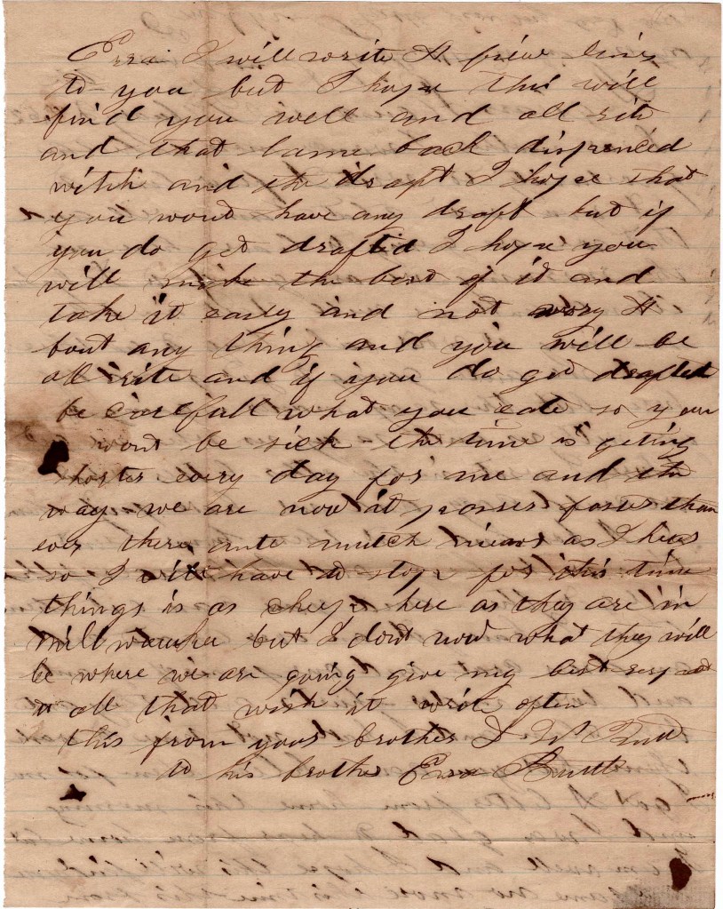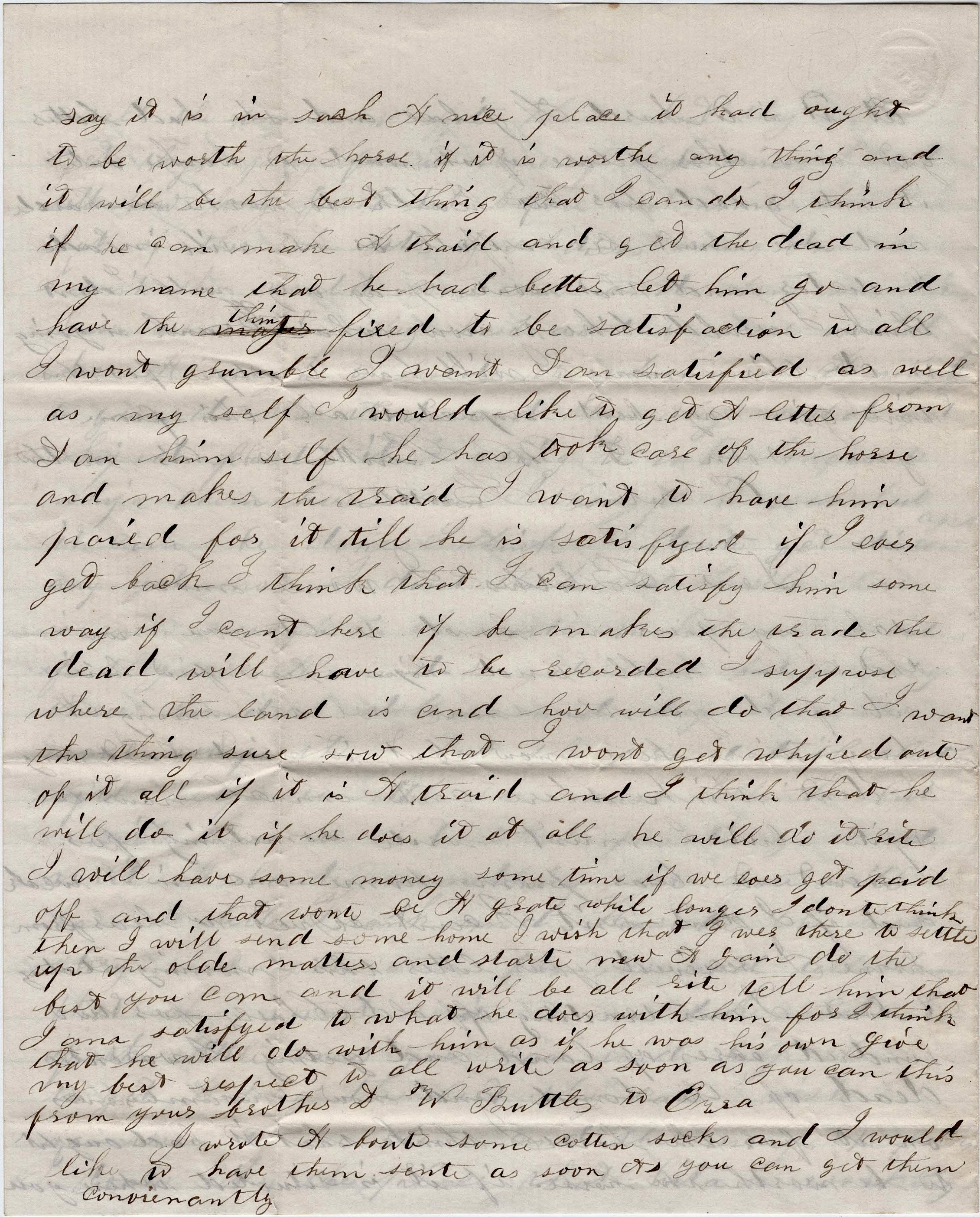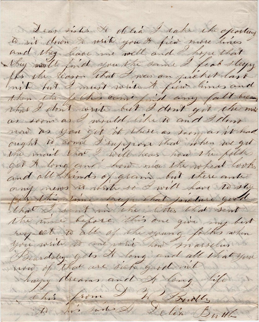 I suppose you think that there is something the matter but there ain’t. The reason that other letter is so long being wrote is that the mail was not going out so it will be some time getting one. But I mean to write once a week unless there is something in the way. Mart don’t write to me and Ezra Beardsley I wrote last to them. I would like to hear from them and Lige but they don’t answer my letters and I don’t write to them till they do to me. And when you write to me again, I wish you wold tell me about Misty Wilds and Mrs. and William Morrison and all the boys. You know you asked me about that house. If he don’t ask too much, you had better buy it and then get a woman and put in some of grain. My best respects to all the inquiring friends. — D. W. Buttles