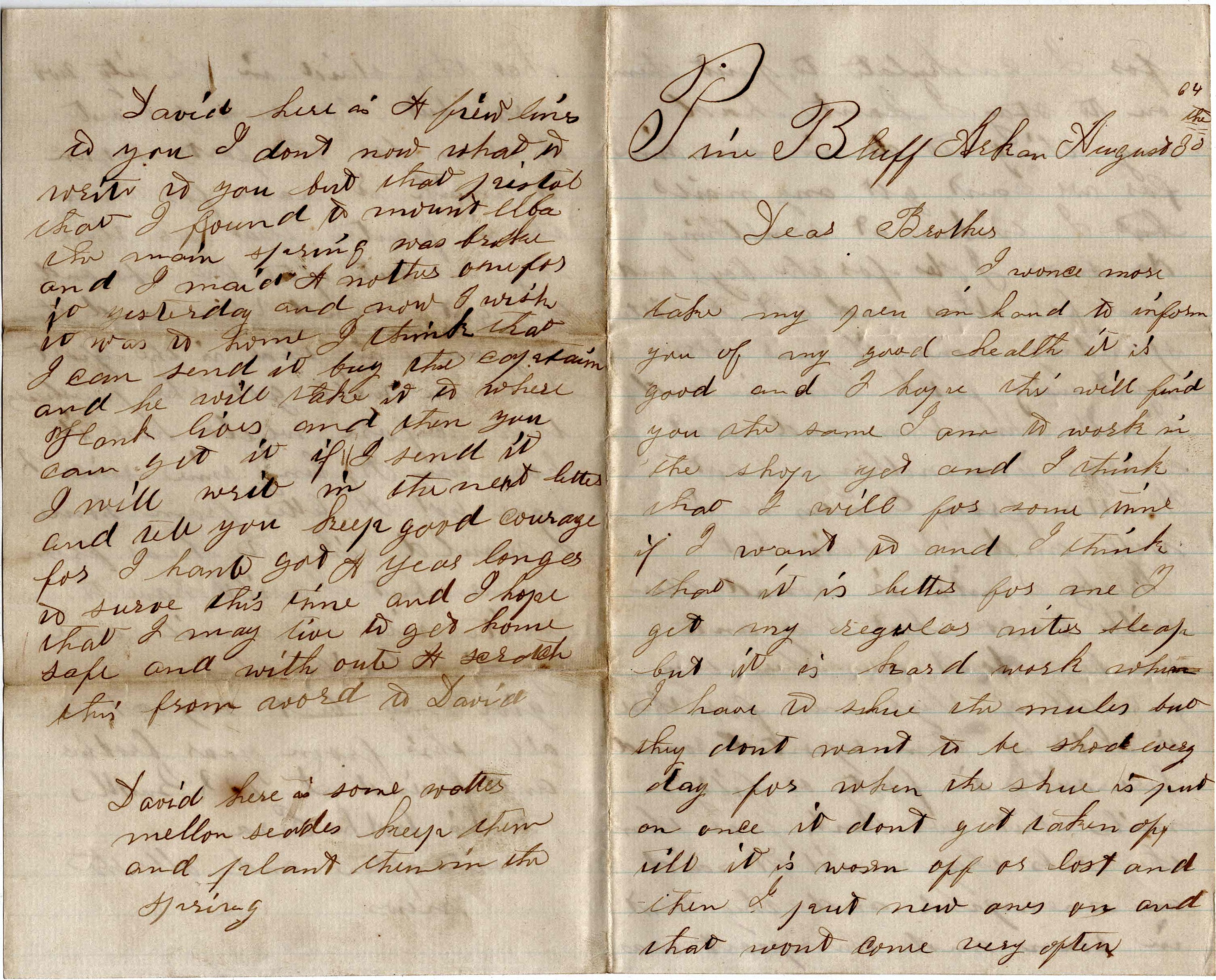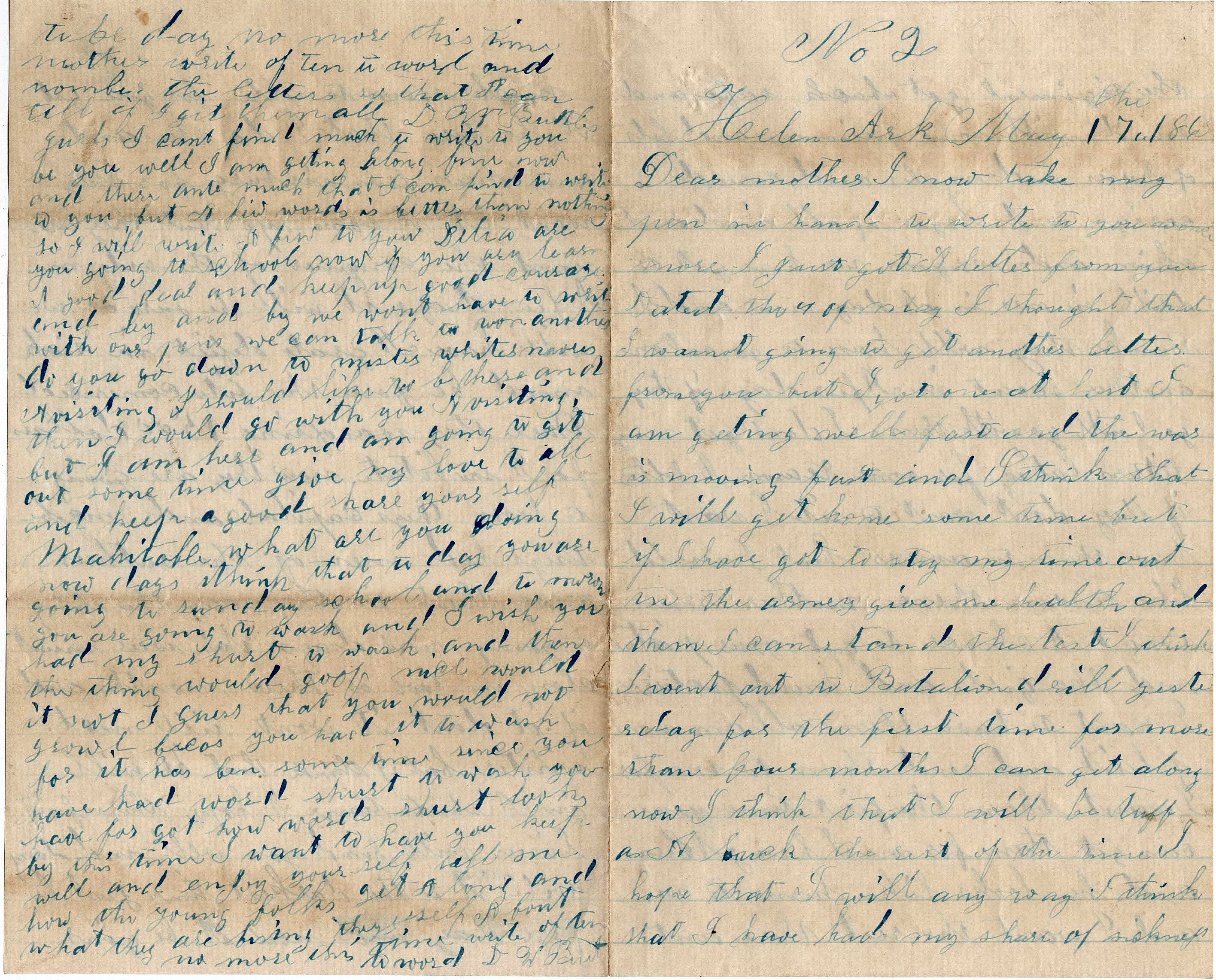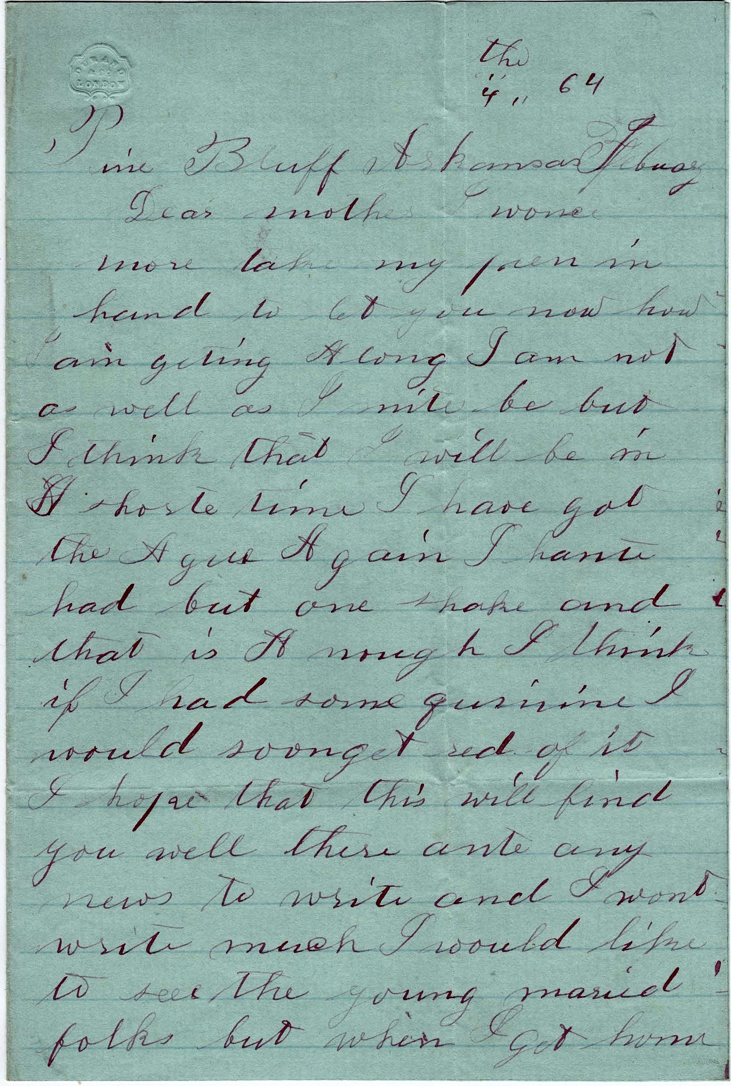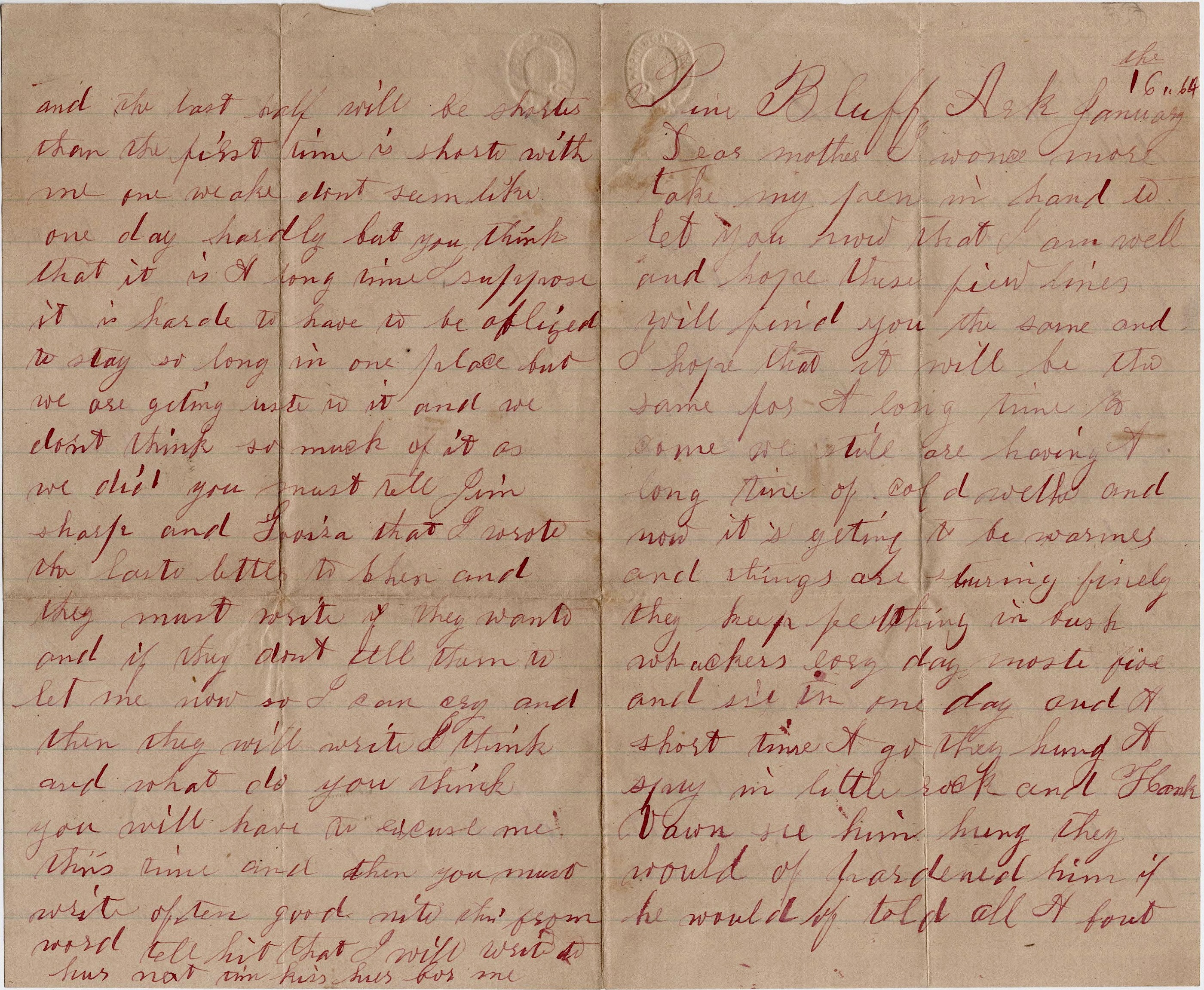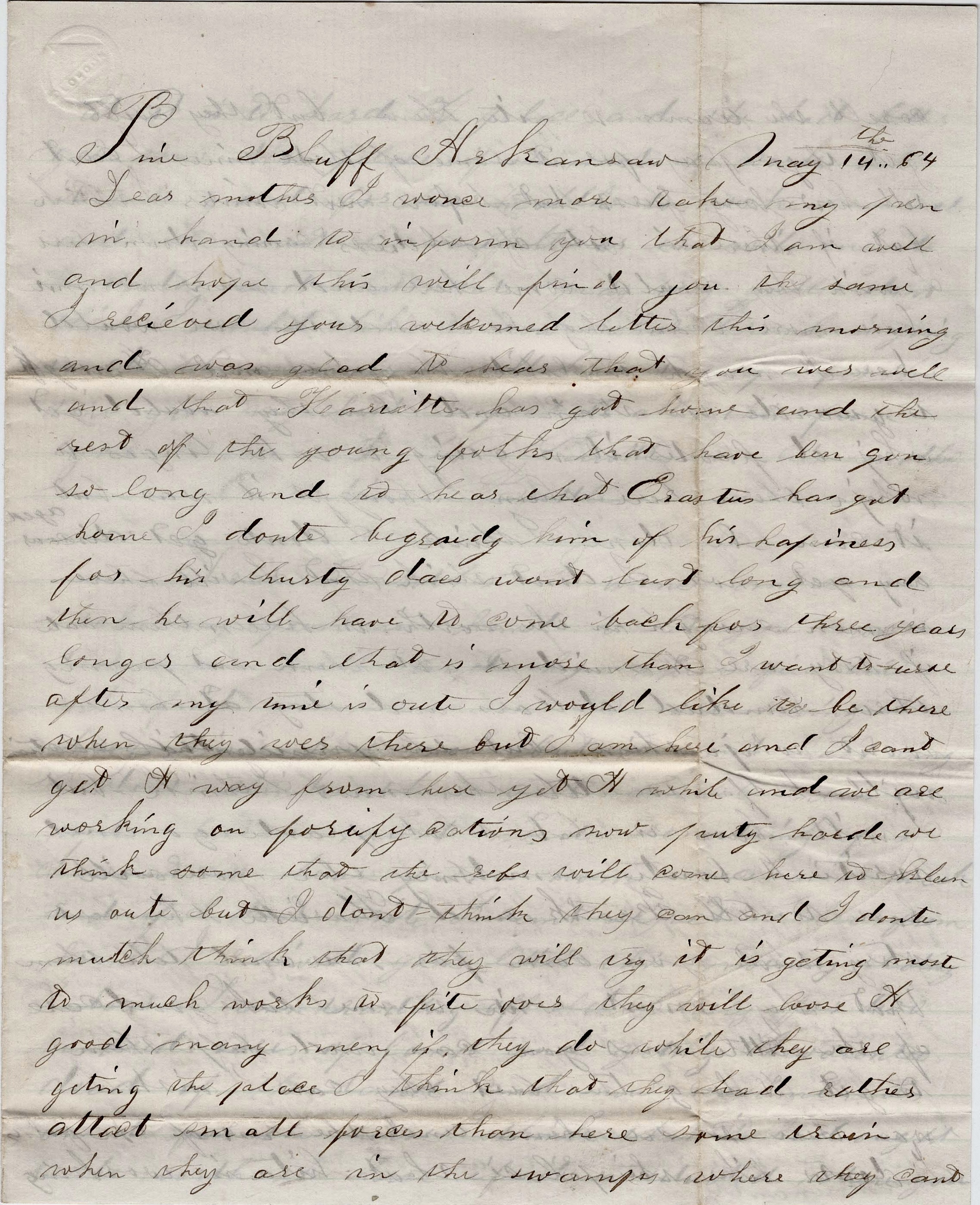 There was a few Old Price men got in here the other day and [Archibald] Dobbins’ Cavalry and himself is prisoner of war, so they say. This army on this side of the river is gone up and there ain’t many of the guerrillas left neither. And the cars run every day to the Bluff [DeVall’s Bluff] and back. But the boats don’t run up the White River [to Pine Bluff] but once a week and sometimes twice adn then we get our mail. But it is a long time coming—14 and 18 days coming—and that is some time coming. But I get one once in a week generally. But this time it failed. But I thought that I must write [even] if I did not get one from home. But I can’t think if much to write. But I hope in a few months that I will be where I won’t have to write what I want to tell my folks. I can [just] talk to them and that will be a great pleasure to me if that time will soon come and this aw[ful] war will be done and no more bloodshed. What rejoicing will be then. No more this time. Give my best respects to all. Write soon. This from your dear son, — D. W. Buttles