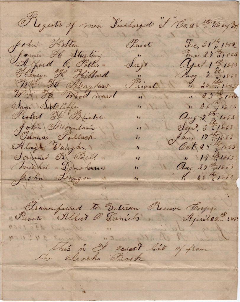 They sent five of our company up here and the rest of them they left to Helena. But they won’t do anything with us till we can get our descriptive rolls and it will take some time. When we get them, then they will examine us and give us our discharge if they think we need it. If they think that they don’t, they will try to cure them. The surgeon on the boat that we came up on said that I had rheumatism and chronic disease and if that is so, they will discharge me. But we can’t tell anything in the army what they will do. I the army, they will do what they are a mind to.