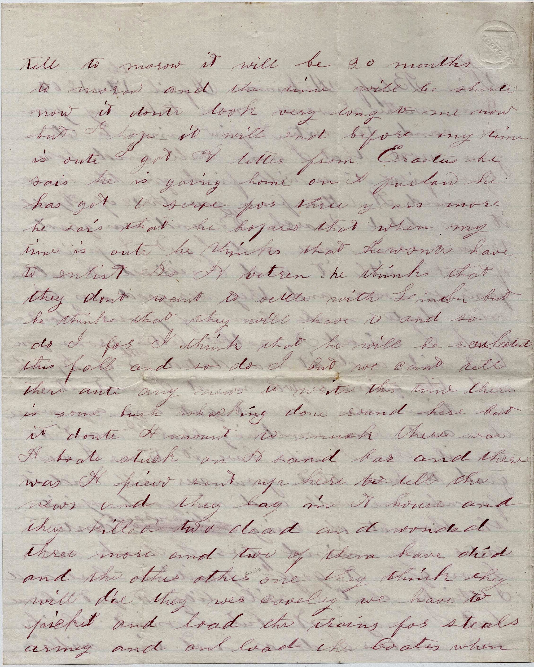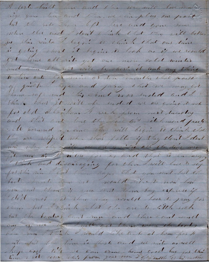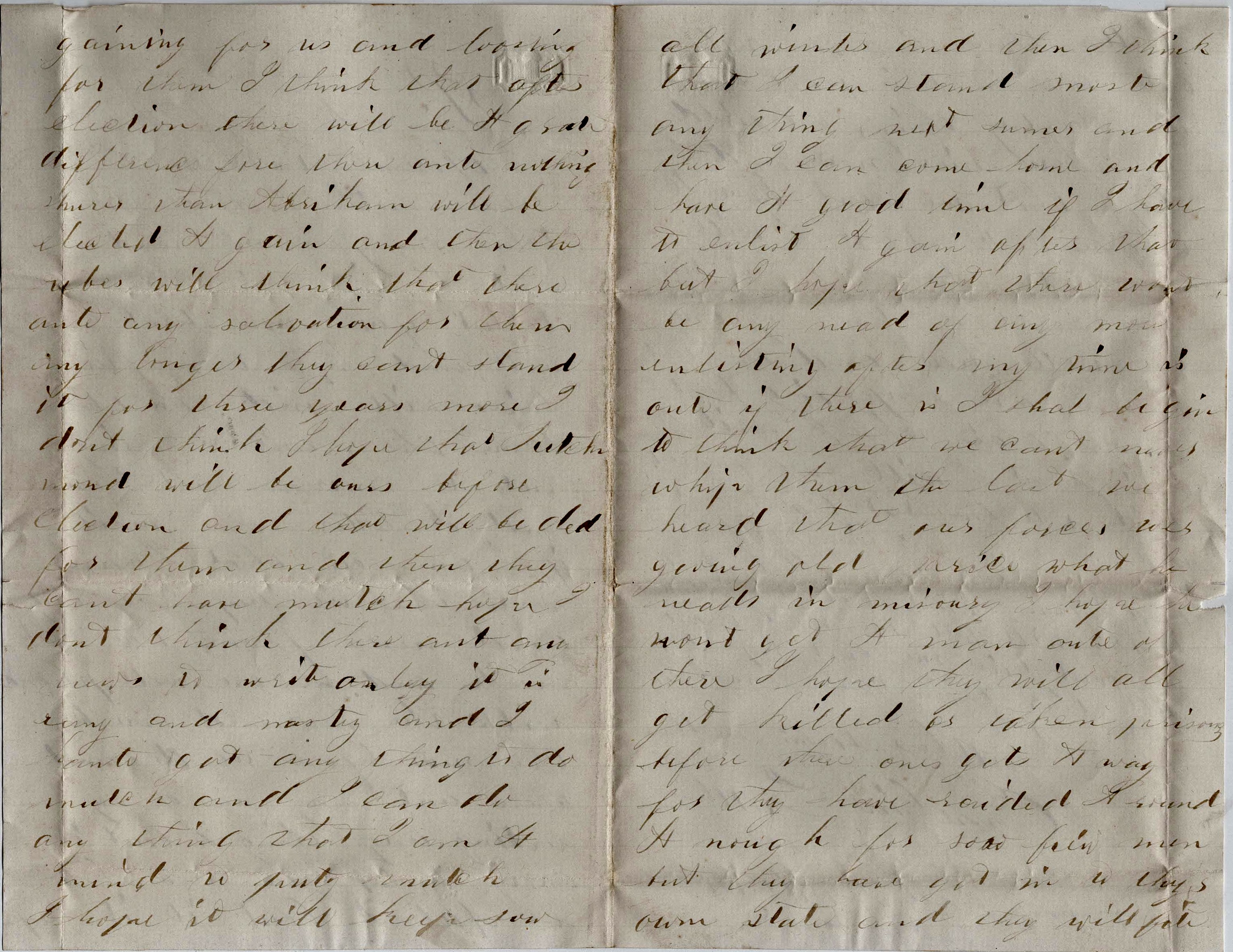 There ain’t any news to write—only it is rainy and nasty and I han’t got anything to do much and I can do anything that I am a mind to pretty much. I hope it will keep so all winter and then I think that I can stand most anything next summer and then I can come home and have a good time [even] if I have to enlist again after that. But I hope that there won’t be any need of anymore enlisting after my time is out. If there is, I shall begin to think that we can’t never whip them.