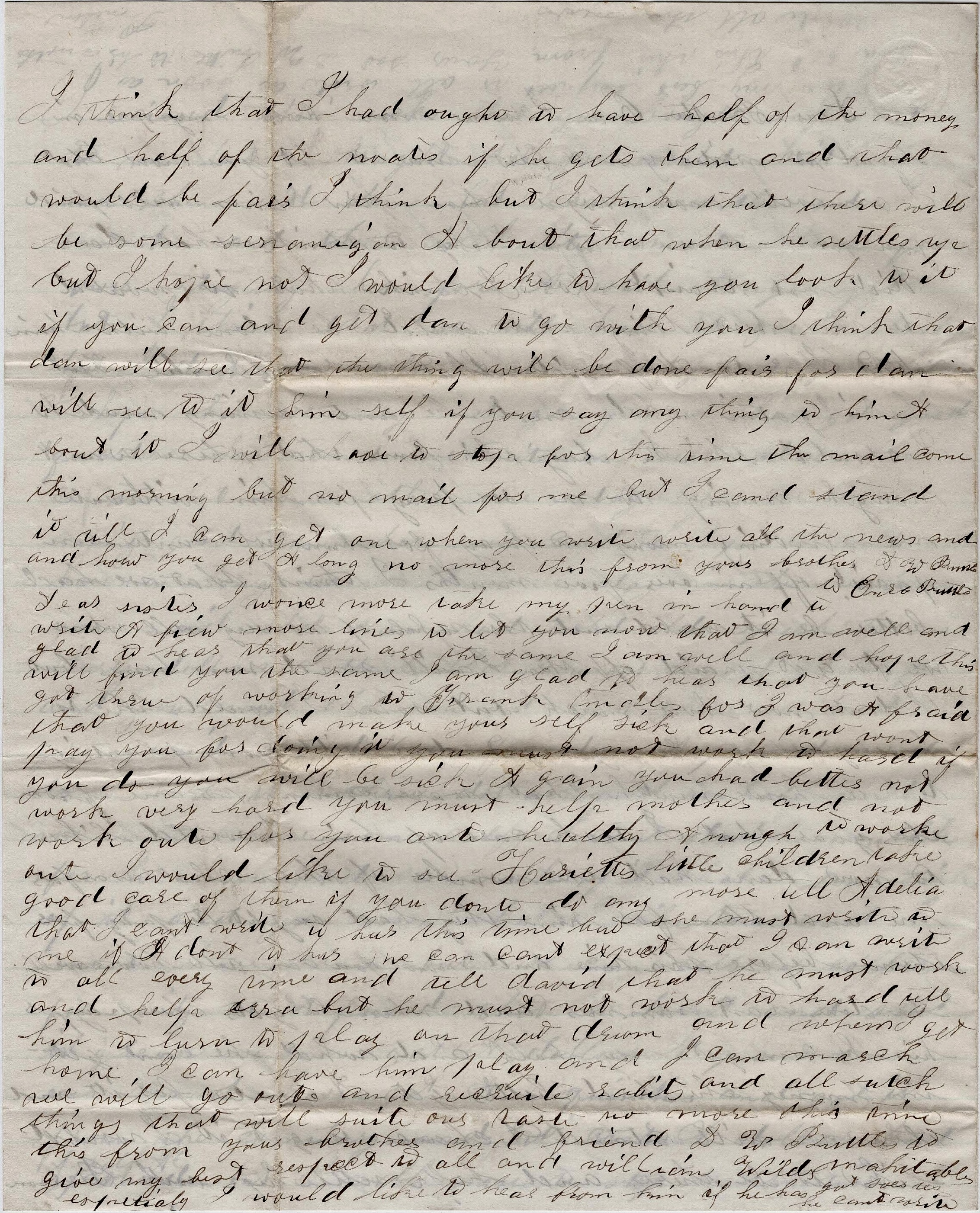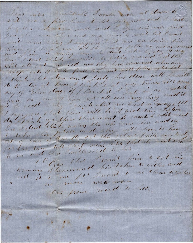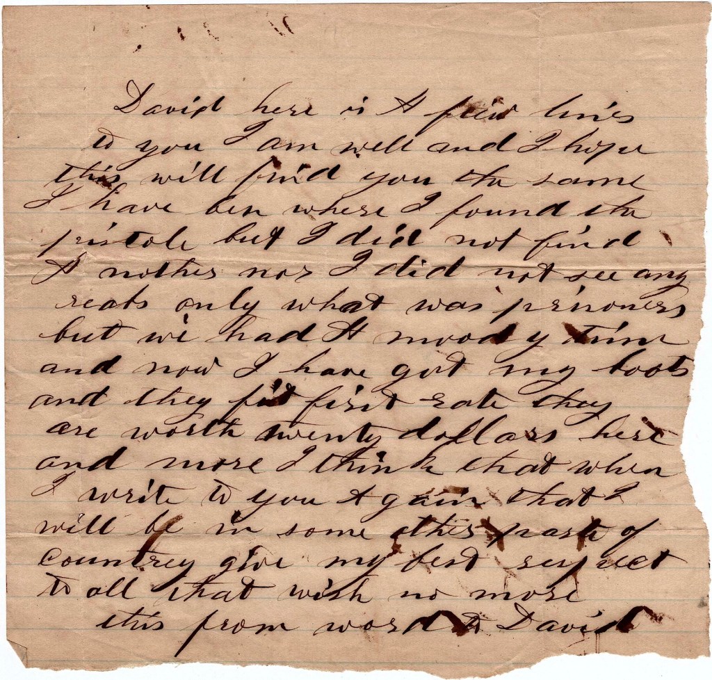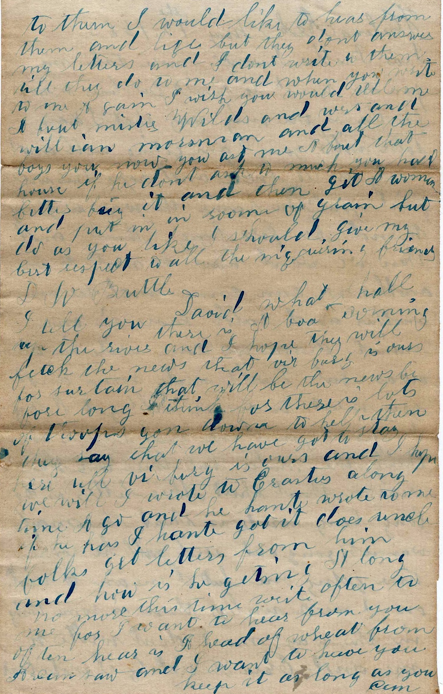 David, how does the times do with you now-a-days? Do you shoot my rifle much now-a-days? I want to have you learn to shoot better than I can so when I come home that you can beat me. No more this time. Write to me. This from your brother. Girls, here is a few lines to you. Hit, I am sorry that you ain’t better than you be. I can’t write much to you but you must write every time the rest do. Write how all the young folks get along. Give my love to all that wish it. This from your brother.
