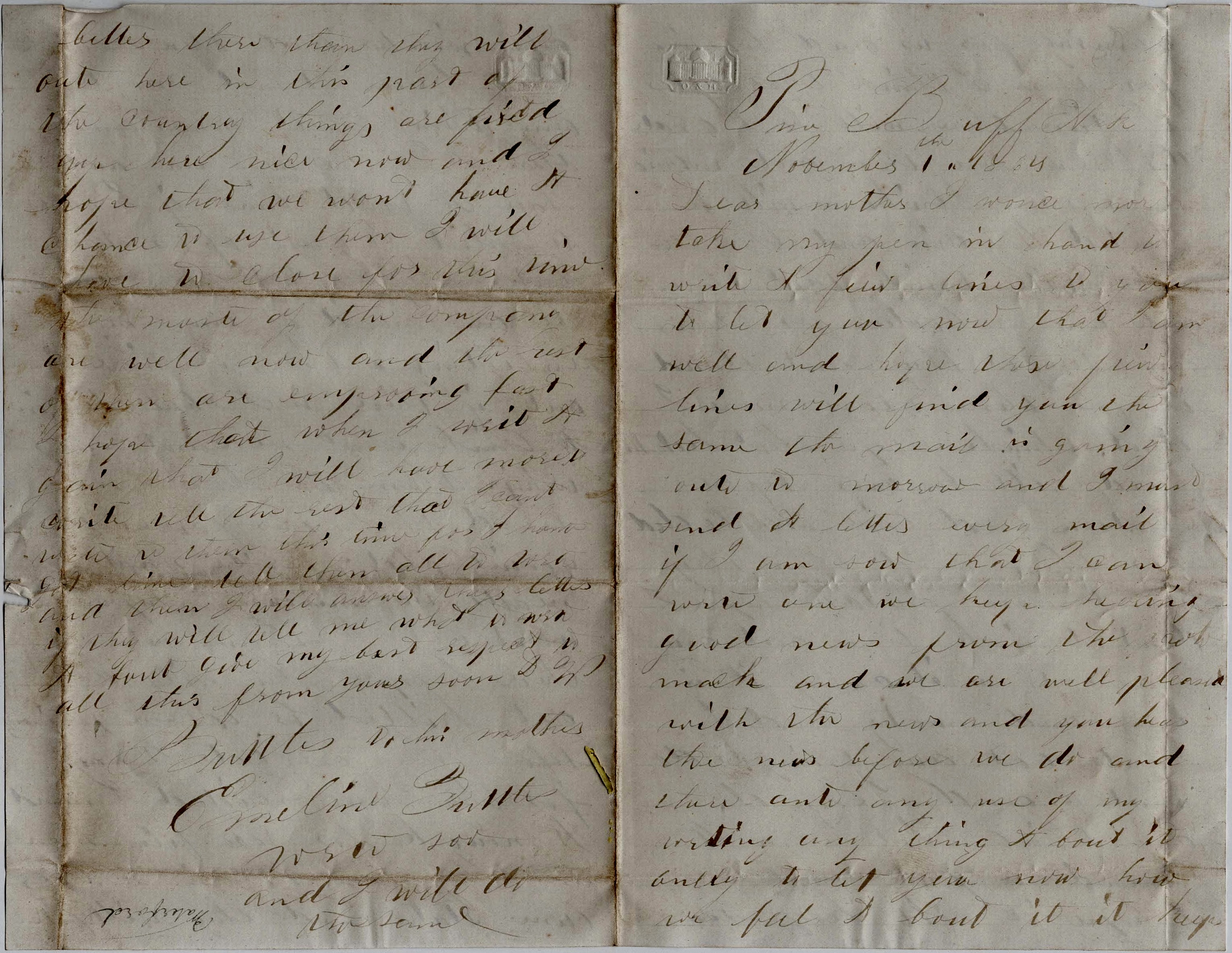 Mother, I just received another letter from you this evening and I was glad to hear that you were well but sorry to hear that the crops have failed so bad. But flour ain’t only half as high there as it is here but when you hain’t got anything but corn and meat, then you will think that it is hard times. That is all the folks have to live on here and not much of that. They have some flour off us as we have more than we can use but if we were on the march, we would not get any of it. But we have got to stay here this fall and winter of the rebs don’t drive us away. But sing a sassy song and go on rejoicing—that is the way. Never borrow trouble for it comes fast enough without making it. I think that we enlisted in just the right time for it will be one way or the other by the time that our time is out. We will be paid off this week. They say [the pay master] is here now. He come on this boat that brought the mail. No more. Good night. Write soon.