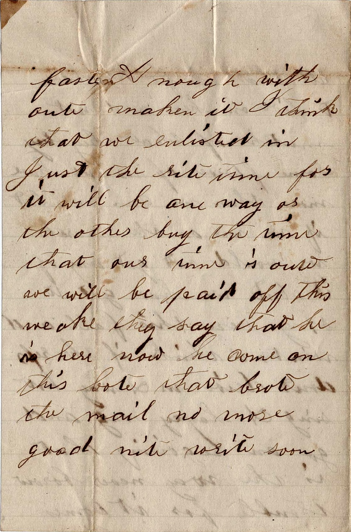 We han’t got any pay yet and I don’t know when we will. You will get tired of waiting before I get it but when I do, you will get it. How does Mister Warner think of the times? Write soon. No more this time. This from your brother and friend, — D. W. Buttles (to Ezra Buttles)
