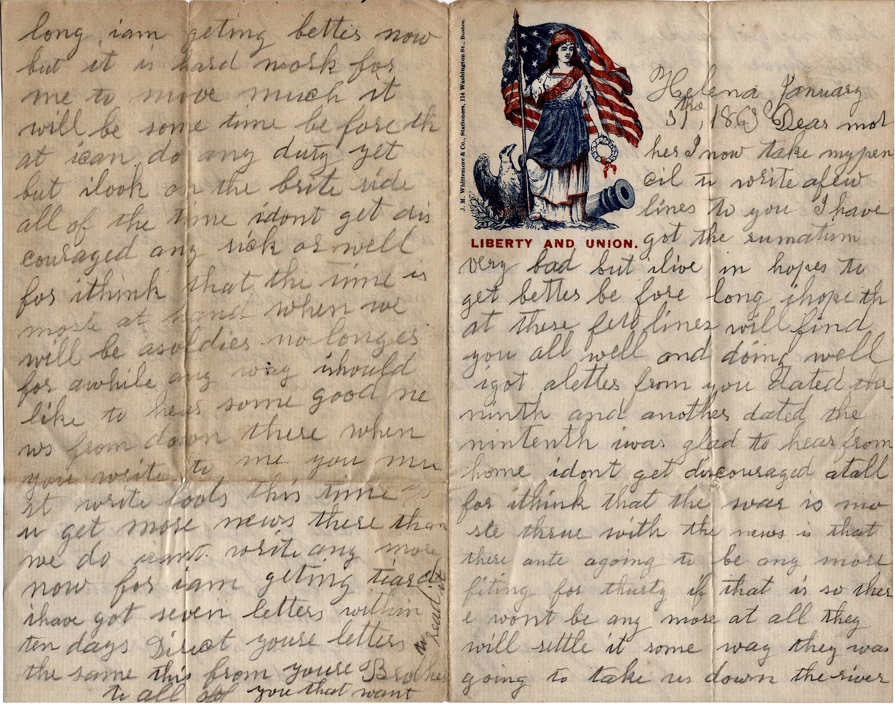 I now take my pencil to write few lines to you. I have got the rheumatism very bad but I live in hopes to get better before long. I hope that these few lines will find you all well and doing well. I got a letter from you dated the 9th and another dated the nineteenth. Was glad to hear from home. I don’t get discouraged at all for I think that the war is most through with. The news is that there ain’t a going to be any more fighting for thirty. If that is so, there won’t be any more at all. They will settle it some way. They was going to take us down the river but we got orders to stay here. They have got enough troops to Vicksburg now—all that they can use. We will stay here for some time I guess. The officers say that we will be discharged between now and July next. I hope and pray that it may be so for there has been enough bloodshed now.