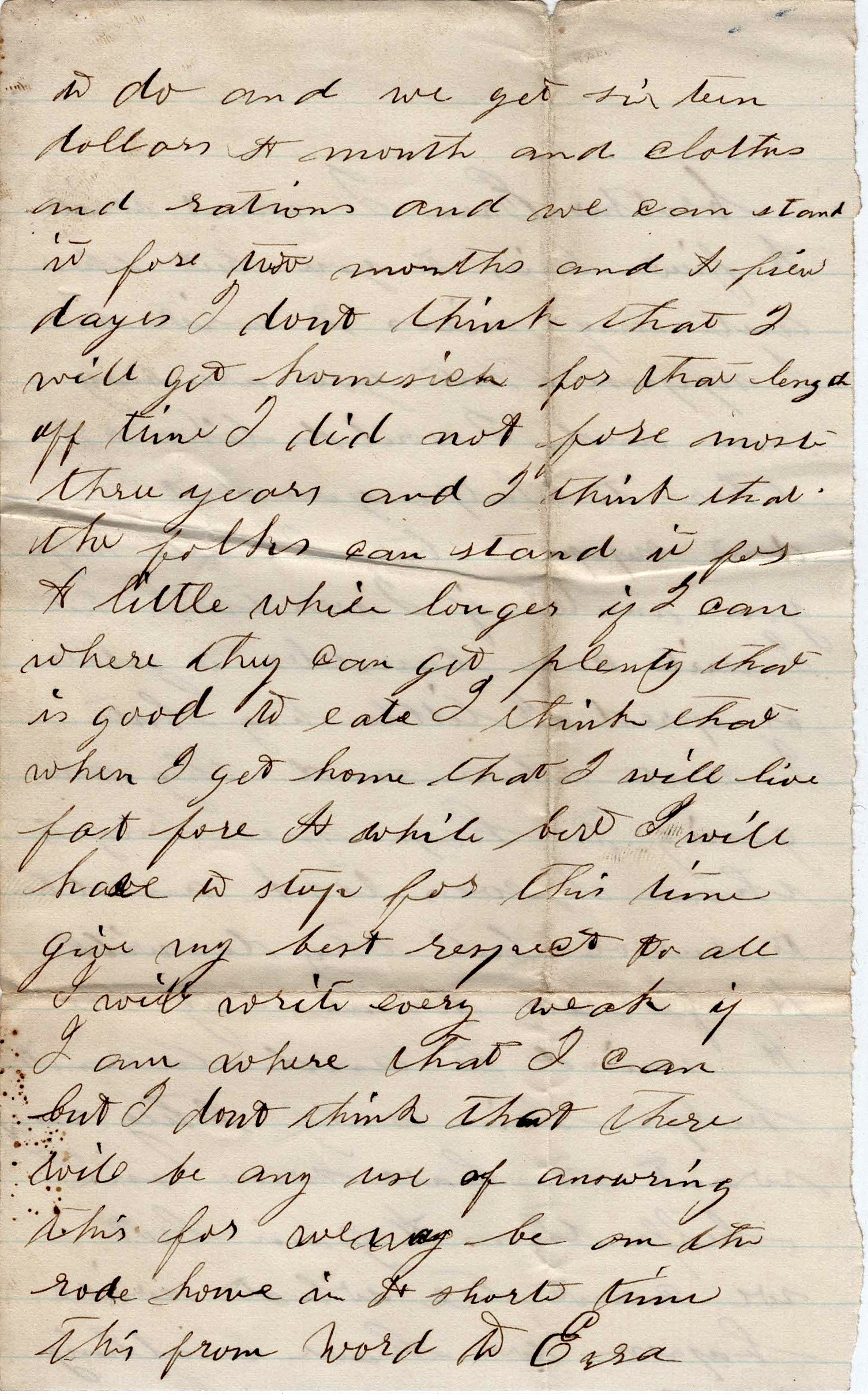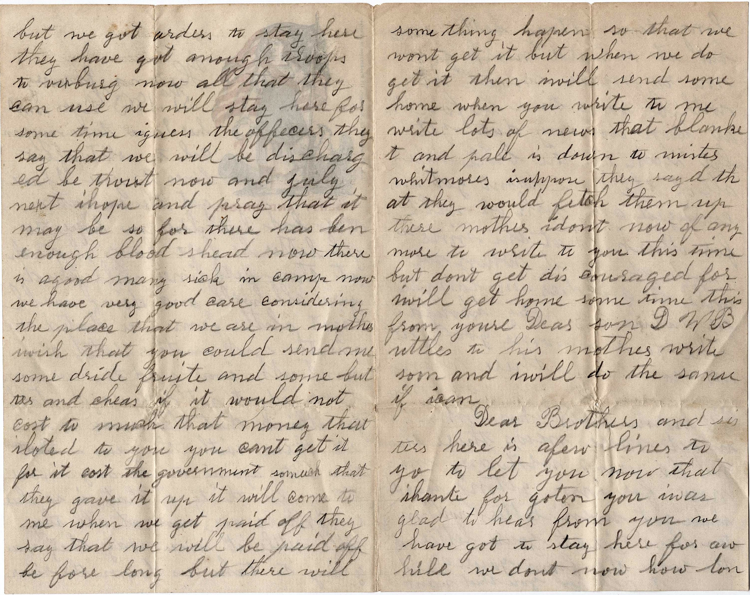 There is a good many sick in camp now. We have very good care considering the place that we are in. Mother, I wish that you could send me some dried fruit and some butter and cheese if it would not cost too much. That money that I allotted to you, you can’t get it for it cost the government so much that they gave it up. It will come to me when we get paid off. They say that we will be paid off before long but there will something happen so that we won’t get it. But when we do get it, then I will send some home. When you write to me, write lots of news.