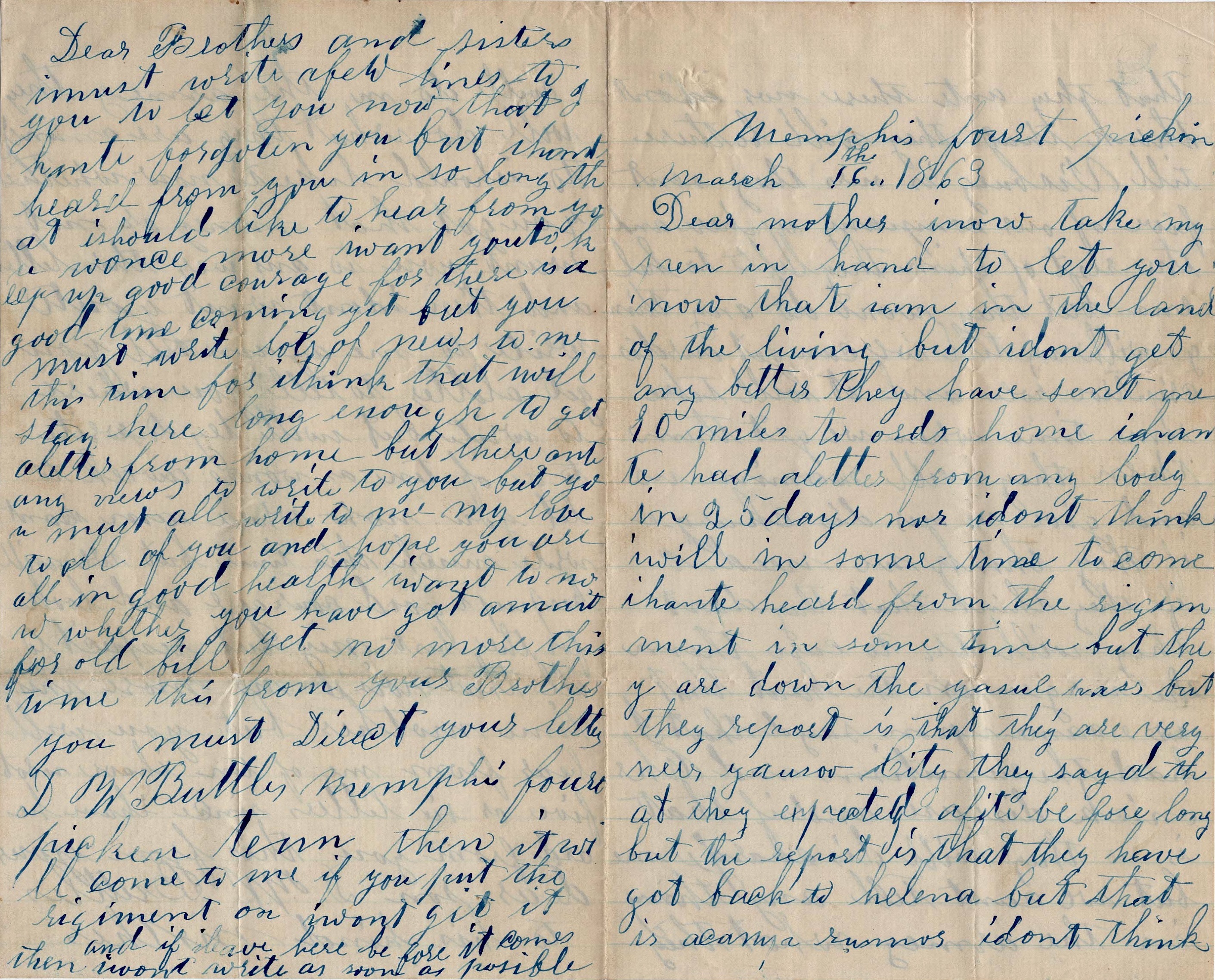Direct your letter to D. W. Buttles, Memphis, Fort Pickens, Tennessee. Then it will come to me. If you put the regiment on, I won’t get it and if I leave here before it comes, then I won’t write as soon as possible.