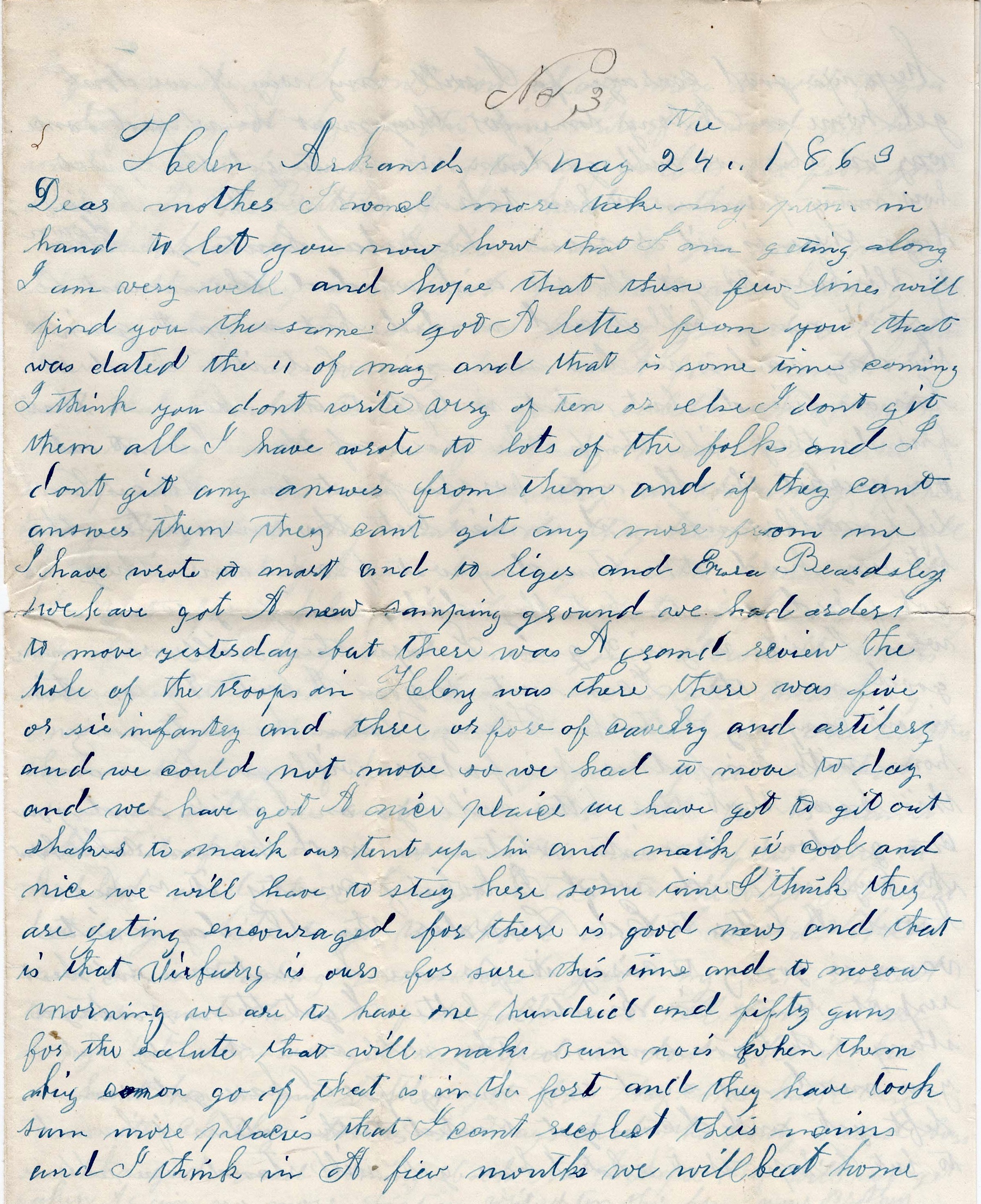 We have got a new camping ground. We had orders to move yesterday but there was a Grand Review. The whole of the troops in Helena was there. There was five or six infantry [regiments] and three or four cavalry and artillery and we could not move so we had to move today and we have got a nice place. We have go to get out shakes to make our tent up here and make it cool and nice. We will have to stay here some time. I think they are getting encouraged for there is good news and that is that Vicksburg is ours for sure this time and tomorrow morning we are to have one hundred and fifty guns for the salute. That will make some noise when them big cannon go off that is in the fort. And they have took some more places that I can’t recollect their names. And I think in a few months we will be at home.
