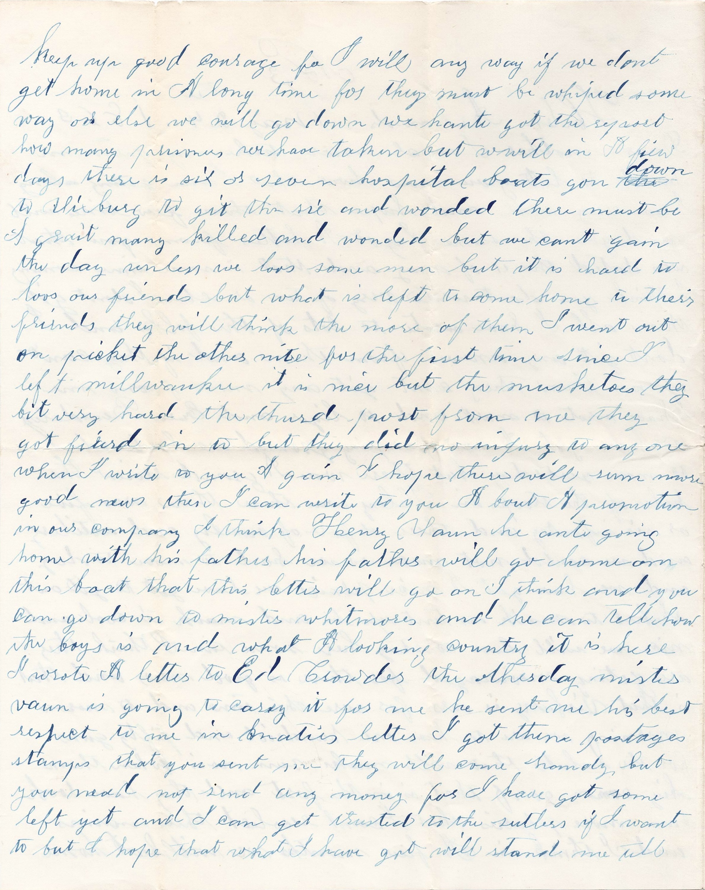 Keep up good courage for I will anyway [even] if we don’t get home in a long time for they must be whipped some way or else we will go down, We han’t got the report [on] how many prisoners we have taken but we will in a few days. There is six or seven hospital boats gone down to Vicksburg to get the sick and wounded. There must be a great many killed and wounded but we can’t gain the day unless we lose some men. But it is hard to lose our friends. But what is left to come home to their friends, they will think the more of them.