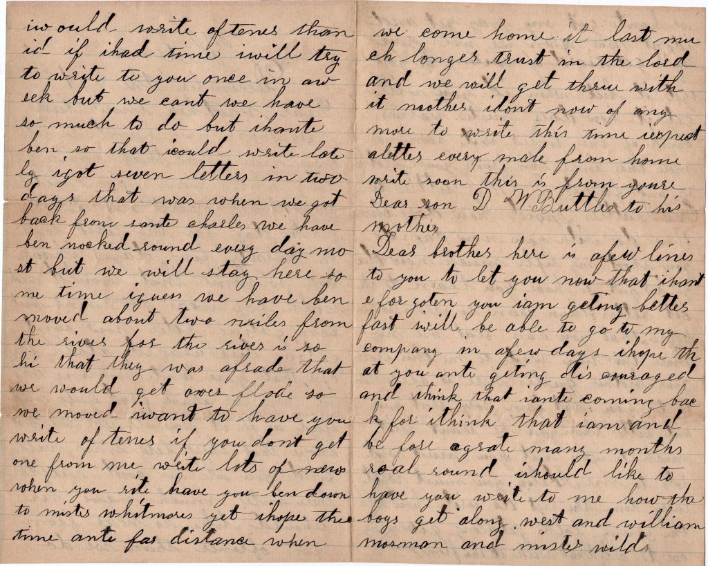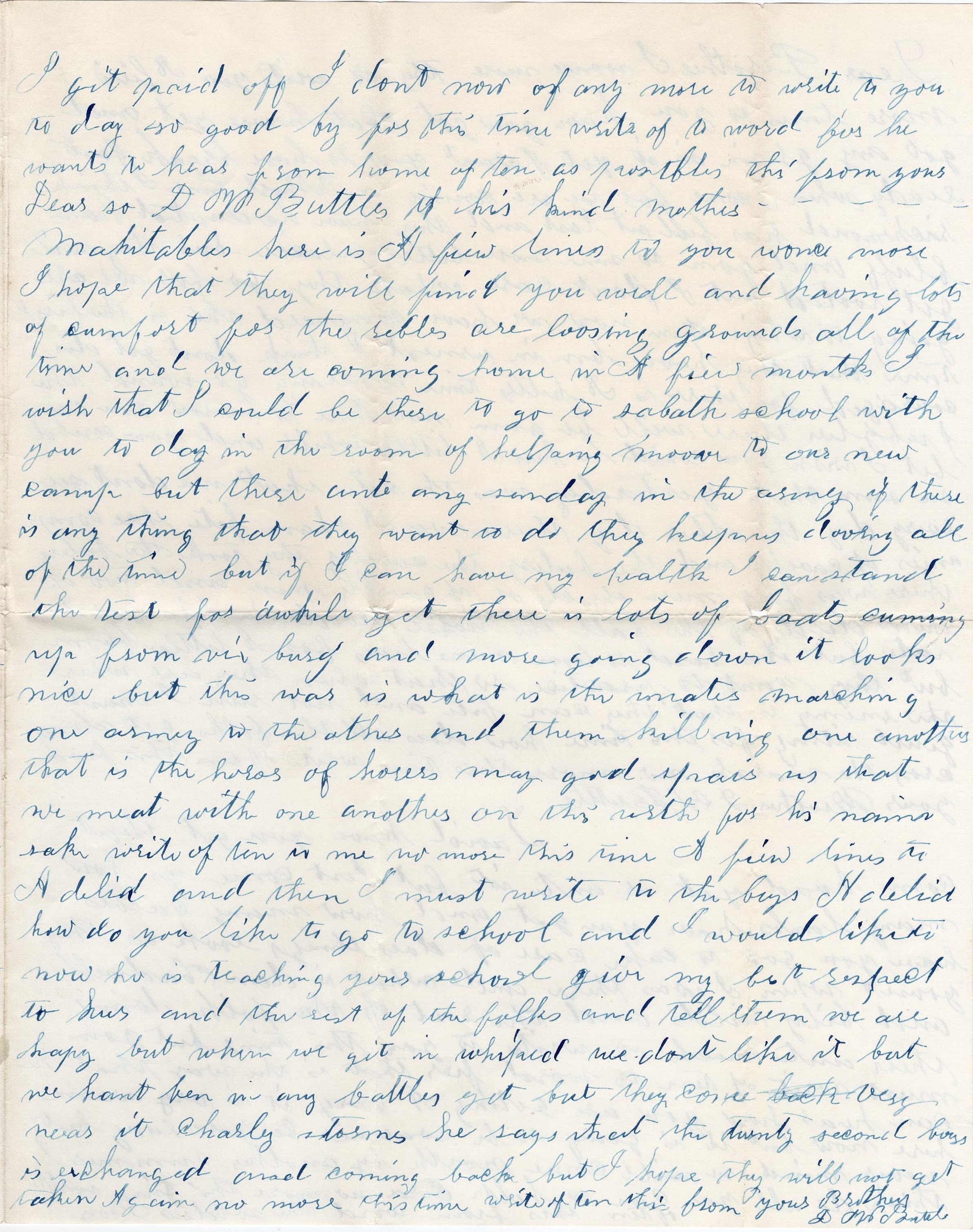 Have you been down to Mister Whitmore’s yet? I hope the time ain’t far distant when we come home. It [won’t] last much longer. Trust in the Lord and we will get through with it. Mother, I don’t know of any more to write this time. I expect a letter every mail from home. Write son, This is from your dear son, — D. W. Butlles