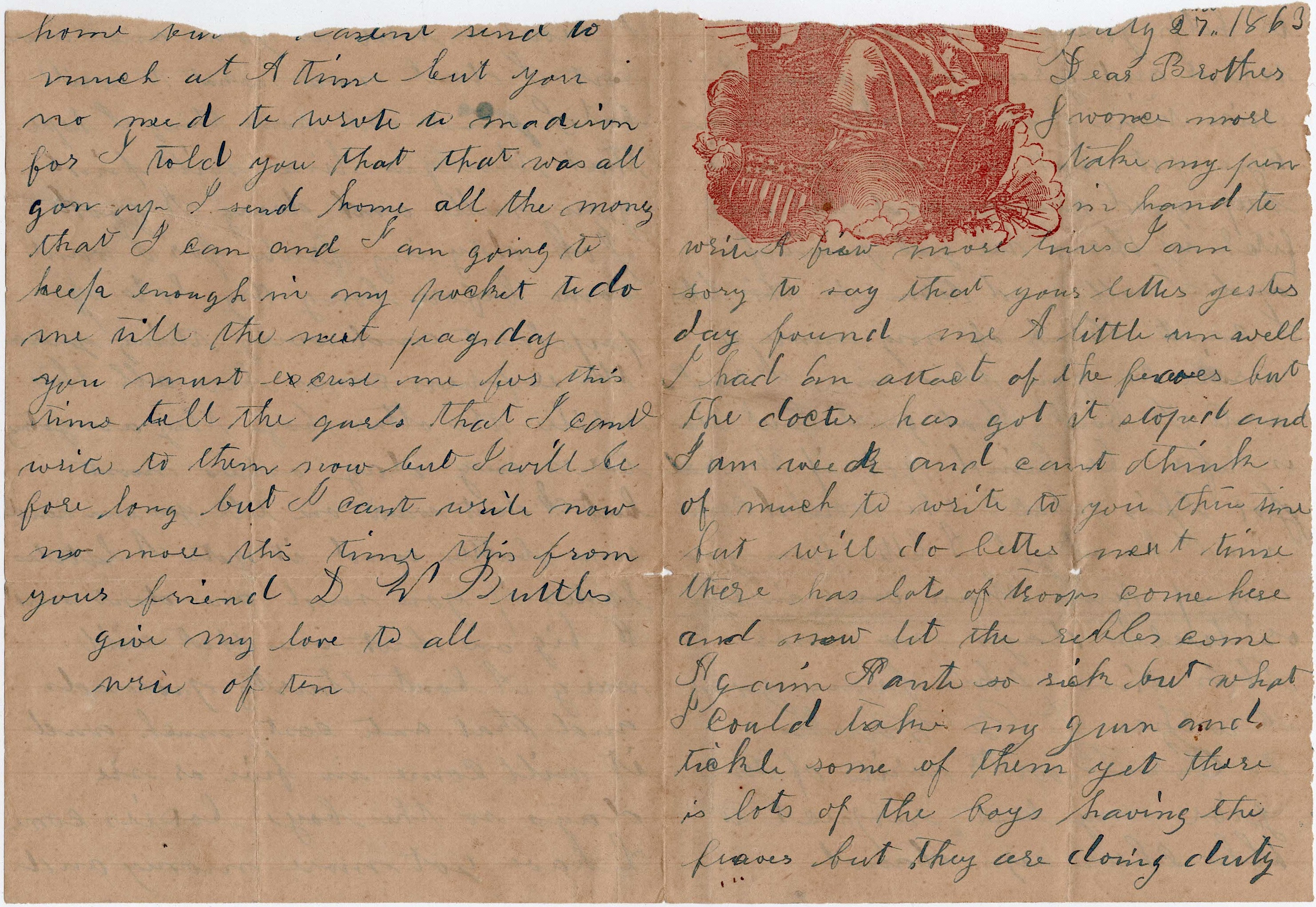 Dear brother, here is a few lines to you to let you know that I han’t forgotten you, I am getting better fast [and] will be able to go to my company in a few days, I hope that you ain’t getting discouraged and think that I ain’t coming back for I think that I am and before a great many months roll round. I should like to have you write to me how the boys get along west and William Mosman and Mister Wilds.