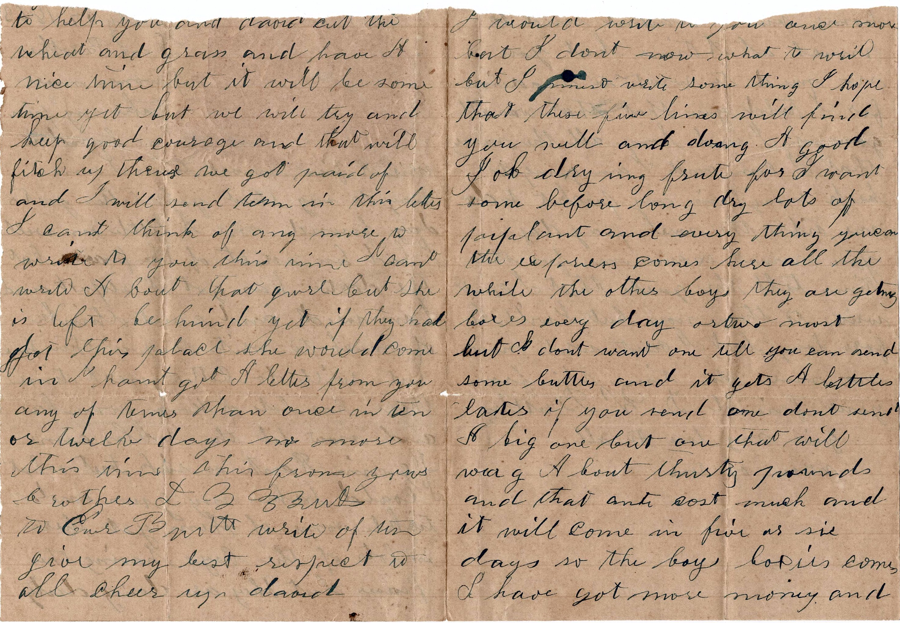 [paper torn at top]… I would write to you once more but I don’t know what to write but I must write something. I hope that these few lines will find you well and doing a good job drying fruit for I want some before long. Dry lots of pie plant [rhubarb] and everything you can. The Express comes here all the while. The other boys, they are getting boxes every day or two most. But I don’t want one till you can send some butter and it gets a little later. If you send one, don’t send a big one but one that will weigh about thirty pounds and that ain’t cost much and it will come in five or six days. So the boys boxes come. I have got more money and….send to much at a time. But you [have] no need to write to Madison for I told you that that was all gone up. I send home all the money that I can and I am going to keep enough in my pocket to do me till the next pay day.
