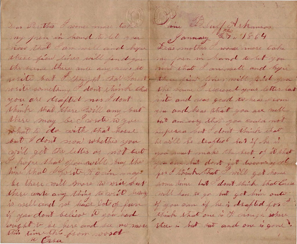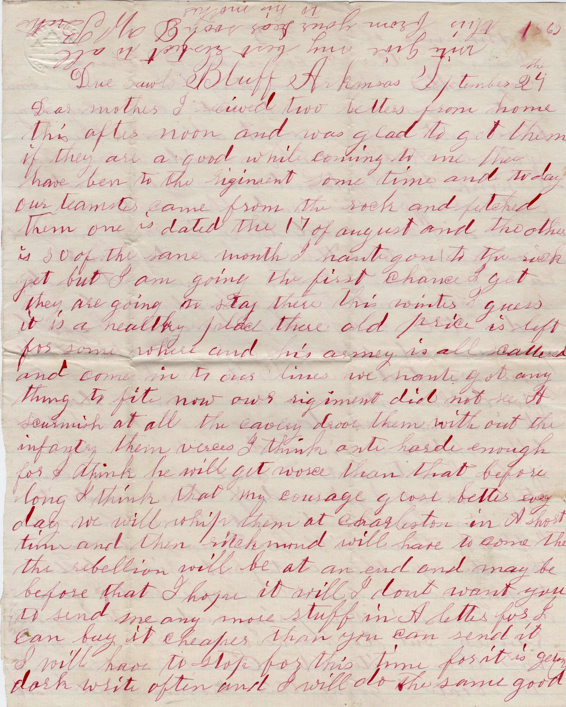I received two letters from home this afternoon and was glad to get them [even] if they are a good while coming to me. They have been to the regiment some time and today our teamster came from the Rock [Little Rock] and fetched them. One is dated the 17th of August and the other is 30th of the same month. I han’t gone to the Rock yet but I am going the first chance I get. They are going to stay there this winter, I guess. It is a healthy place there. Old [Gen. Sterling] Price is left for somewhere and his army is all scattered and come into our lines. We han’t got anything to fight now. Our regiment did not see a skirmish at all. The cavalry drove them without the infantry. Them verses I think ain’t hard enough for I think he will get worse than that before long. I think that my courage grows better every day. We will whip them at Charleston in a short time and then Richmond will have to come. Then the rebellion will be at an end and maybe before that. I hope it will.