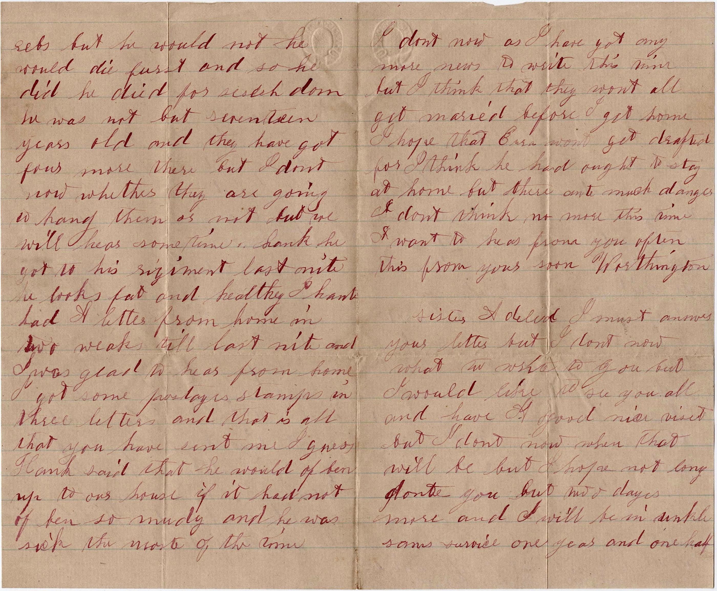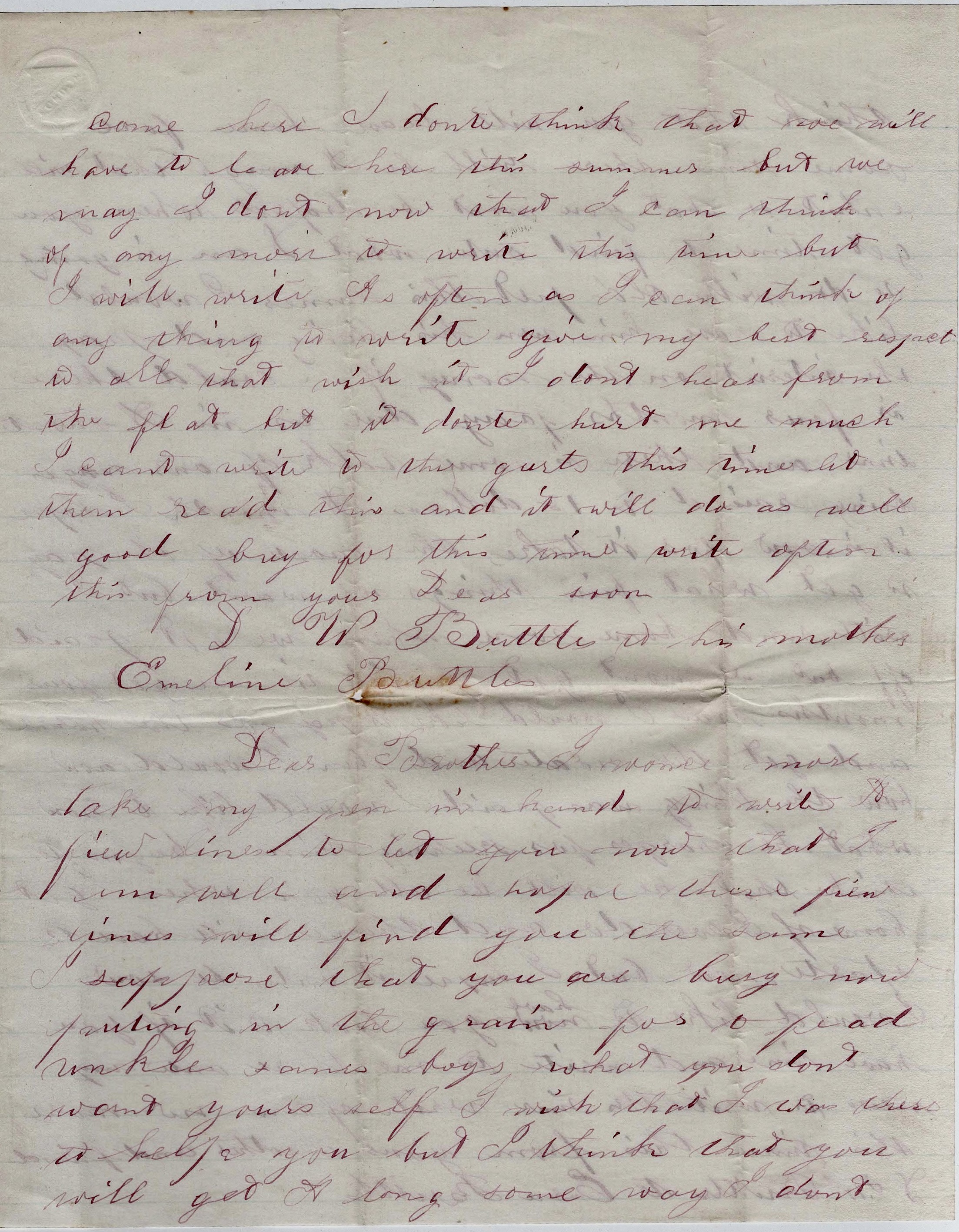 When I write to you again, I hope there will be some more good news. Then I can write to you about a promotion in our company. I think Henry Vaughn ain’t going home with his father. His father will go home on this boat that this letter will go on, I think, and you can go down to Mister Whitmore’s and he can tell how the boys is and what a looking country it is here. I wrote a letter to Ed Crowder and Mister Vaughn is going to carry it for me. He sent his best respects to me in Mattie’s letter. I got them postage stamps that you sent me. They will come handy but you need not send any money for I have got some left yet and I can get trusted to the sutlers if I want to. But I hope that what I have got will stand me till I get paid off. I don’t know of any more to write to you today so goodbye for this time. Write to [your son] Word for he wants to hear from home often as possible. This from your dear son, — D. W. Buttles