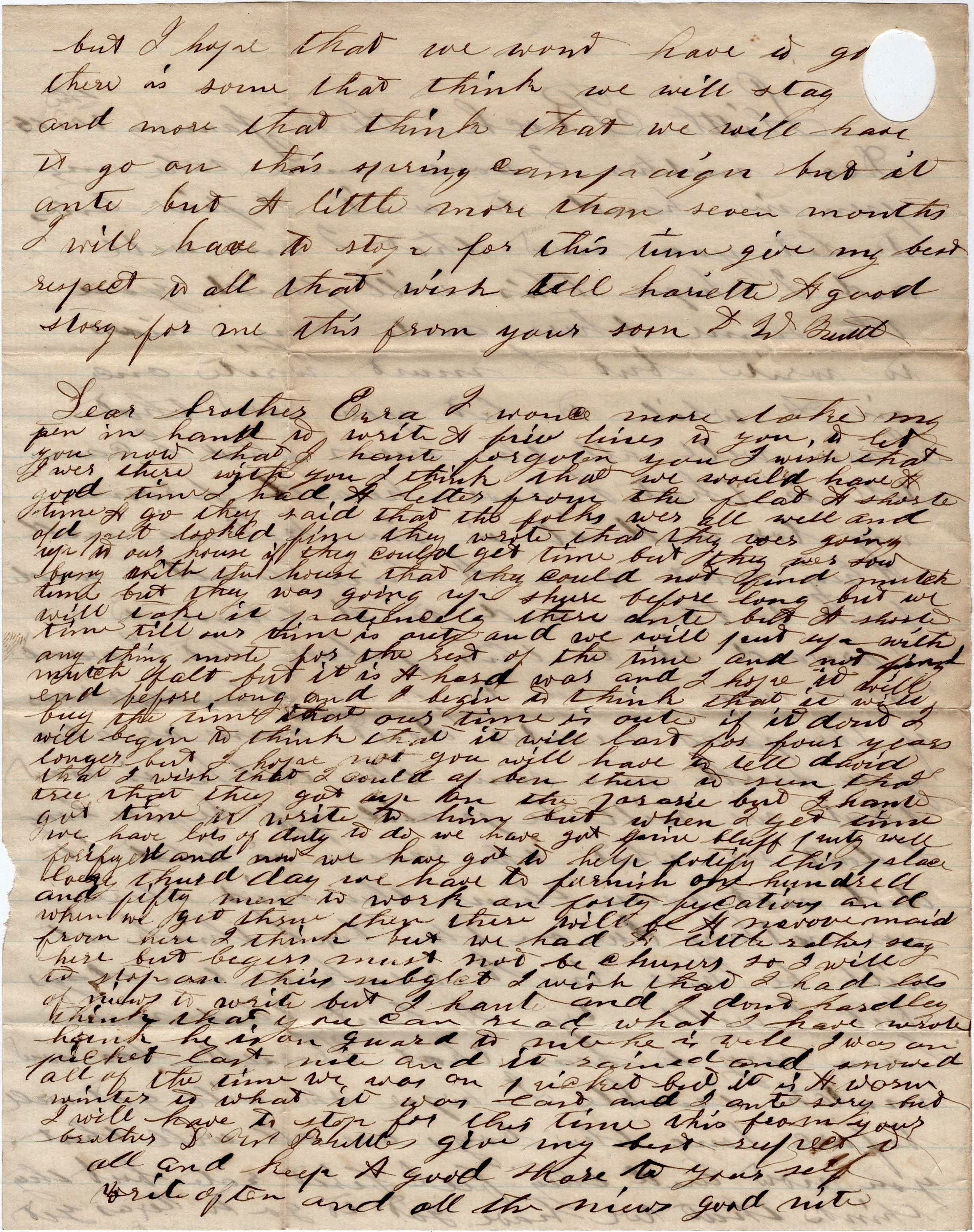Dear brother, I once more take my pen inn hand to write a few lines to let you know that I am well and I hope this will find you the same. We are on duty every day—one day on picket and the next day on breastworks and then after wood and the next day after lumber and then on picket and we don’t have any time hardly to wash our clothes. But I will get a better place soon according to all talk. I will be detailed in the shop again before long. But I don’t care whether I do get a detail or not. Mother said that Erastus’ wife was up there to see our folks….