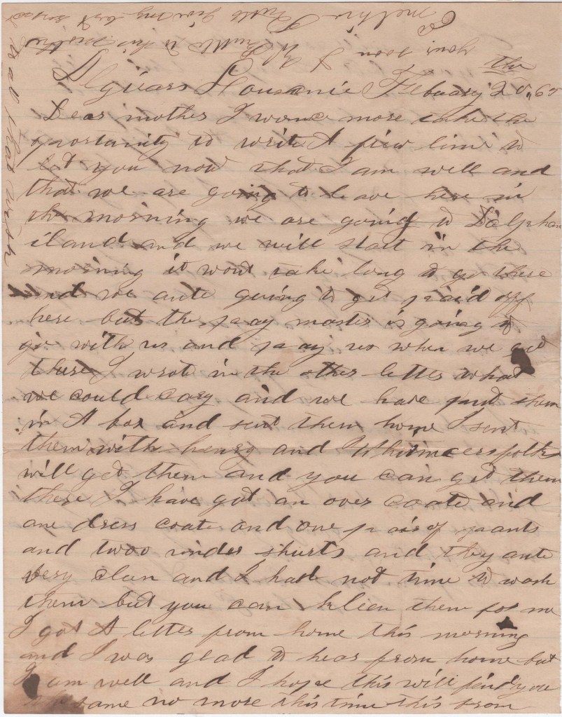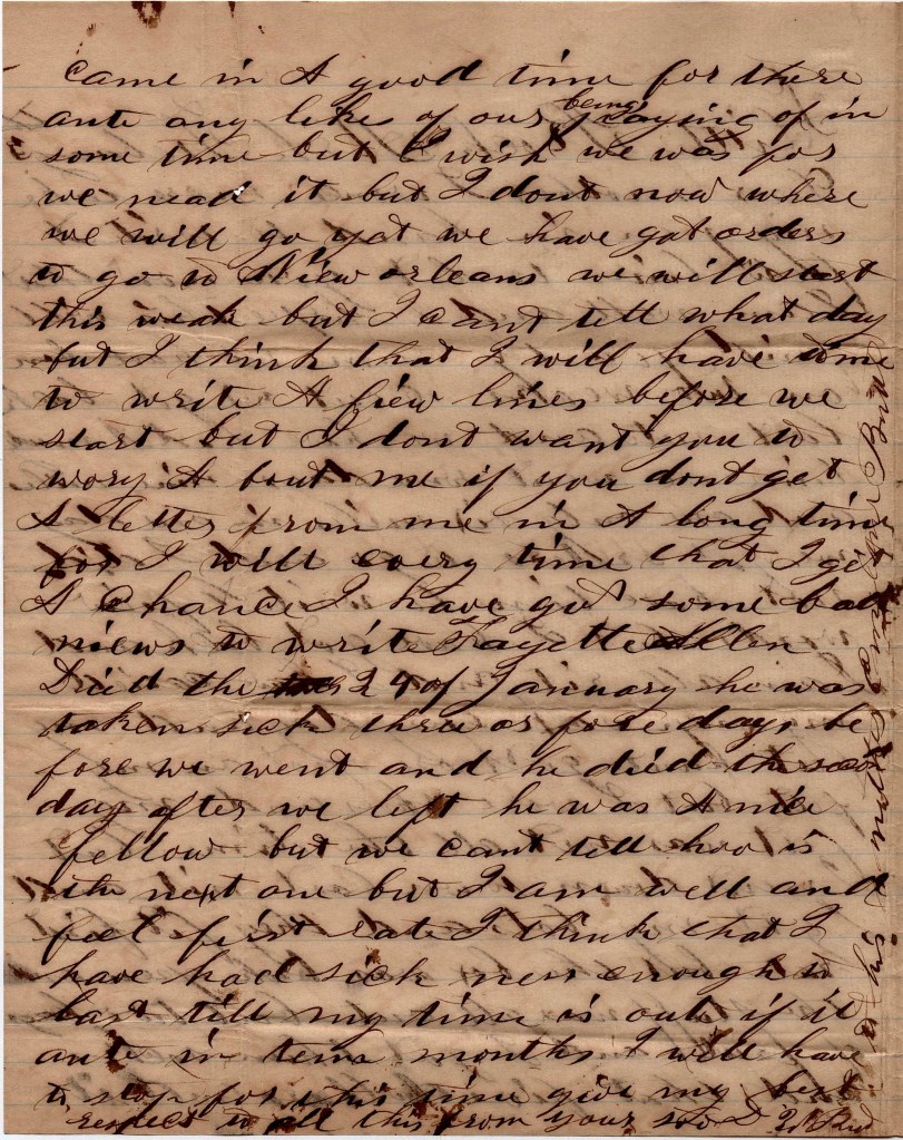I once more take my pen in hand to write a few lines to let you know that I am well and I hope this will find you the same. We have been on two weeks scout and got back last night and we have had a muddy time. We went some days 9 miles and one only six miles in one day. We got orders to go and I did not have time to write a few words but I have got back and I am all right and I have carried my knapsack every day and my feet han’t got a sore spot on my feet but I wore shoes and my feet was wet all the time. But I went down town last night and I got my boots and they fit first rate but the box was broke open and the stuff was all out but two bags of fruit and I got them socks and that five dollars and it came in a good time for there ain’t any likes of our being paid off in some time. But I wish we was for we need it. But I don’t know where we will go yet. We have got orders to go to New Orleans. We will start this week but I can’t tell what day but I think that I will have time to write a few lines before we start. But I don’t want you to worry about me if you don’t get a letter from me in a long time for I will [write] every time that I get a chance.