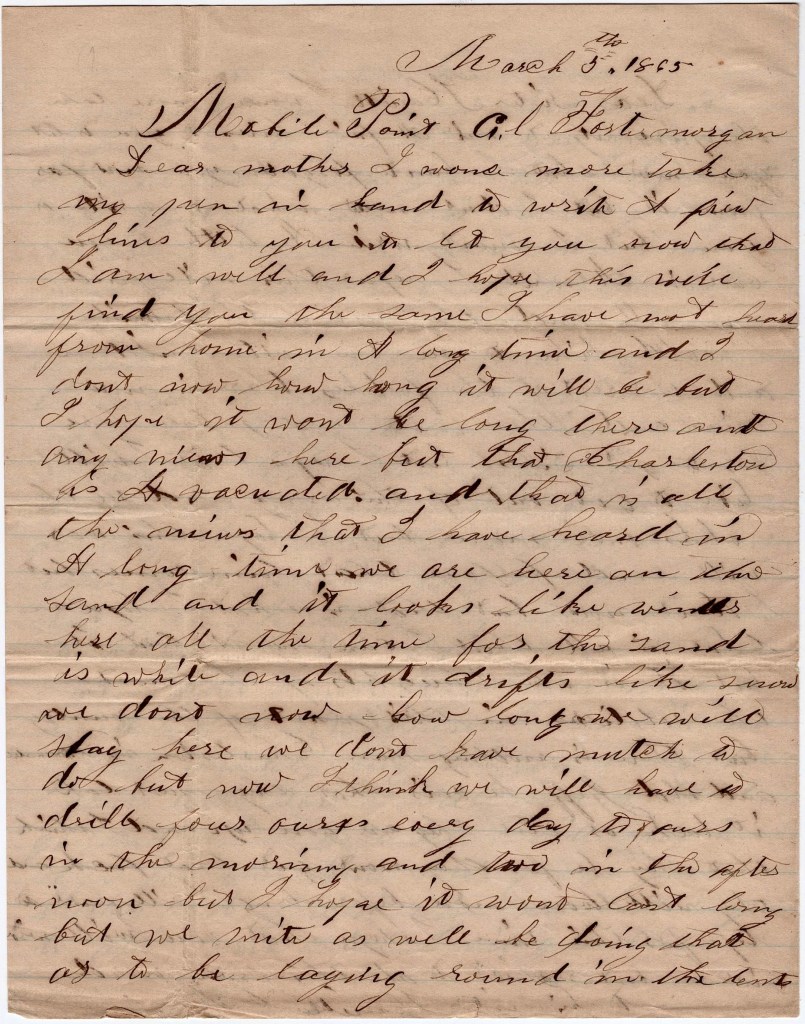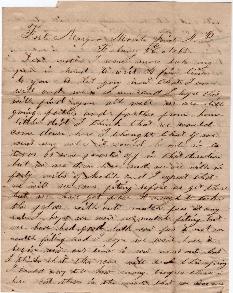 I once more take my pen in hand to write a few lines to you to let you know that I am well and where I am, and I hope this will find you all well. We are still going farther and farther from home. Little did I think that we would come down here. I thought that if we went anywhere, it would be out into Texas or some parts off in that direction. But we are down here and we are within forty miles of Mobile and I expect that we will see some fighting before we get there. But we have got force enough to take the place without much fuss. At any rate, I hope we won’t have to begin now [that] our time is so near out. But I think that the war will end this spring. I could not tell how many troops there is here but there is the most that we was ever with and lots more coming.