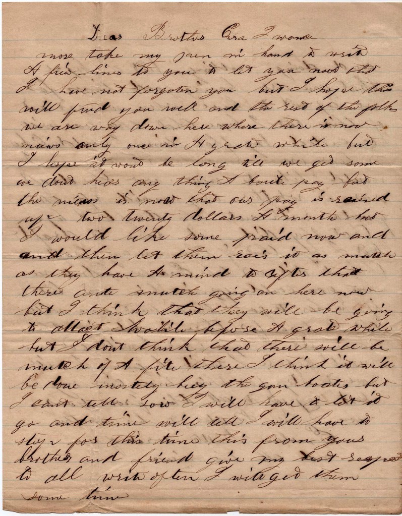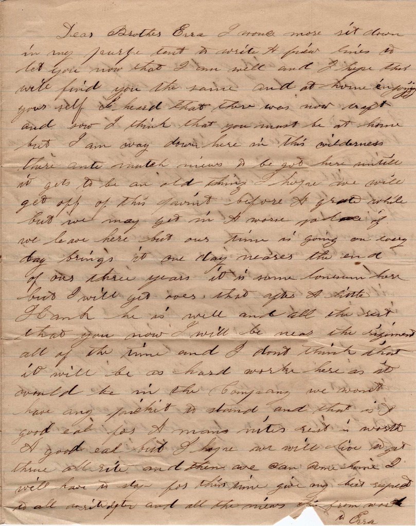 Dear Brother Ezra, …I heard that there was no draft and so I think that you must be at home. But I am away down here in the wilderness. There ain’t much news to be got here until it gets to be an old thing. Hope we will get off of this point before a great while but we may get in a worse place if we leave here. But our time is going on. Everyday brings it one day nearer the end of our three years. It is some lonesome here but I will get over that after a little…