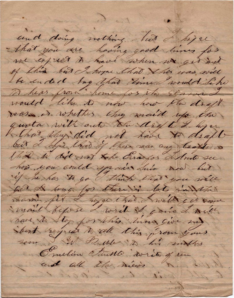 I hope that you are having good times for we expect to have when we get out of this. But I hope that the war will be ended by that time. I would like ot hear from home for the reason I would like to know how the draft was or whether they made up the quota without the draft. I hope that they did not have to draft but I hope that if there was any draft that it did not take Ezra for I don’t see how you could spare him now. But if he has to go, I think that you will get along for there is lots in the same fit. I hope that I will get some mail before I write again. I will have to stop for this time. Give my best respect to all. This from your son, — W. Buttles