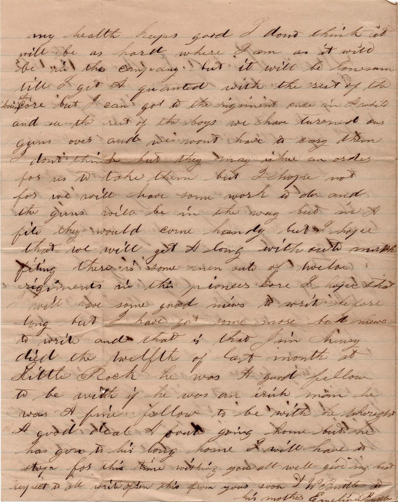I am not with the company now. I am detailed in the Pioneer Corps of the Division and Brigade. I was detailed for a blacksmith but I don’t know what they will have me do and I don’t care much for I think that I can stand it if my health keeps good. I don’t think it will be as hard where I am as it will be in the company but it will be lonesome till I get acquainted with the rest of the Corps. But I can go to the regiment once in a while and see the rest of the boys. We have turned our guns over and we won’t have to carry them, I don’t think, but they may issue an order for us to take them. But I hope not for we will have some work to do and the guns will be in the way. But in a fight, they would come handy. But I hope that we will get along without much fighting. There is some men out of twelve regiments in the Pioneer Corps. I hope that I will have some good news to write before long but I have got some more bad news to write and that is that Jim Murry [of Co. I] died the twelfth of last month at Little Rock. He was a good fellow to be with [even] if he was an Irishman. He was a fine fellow to be with. He thought a good deal about going home but he has gone to his long home. I will have to stop for this time, wishing you all well. Give my best respect to all. Write often. This from your son, — D. W. Buttles