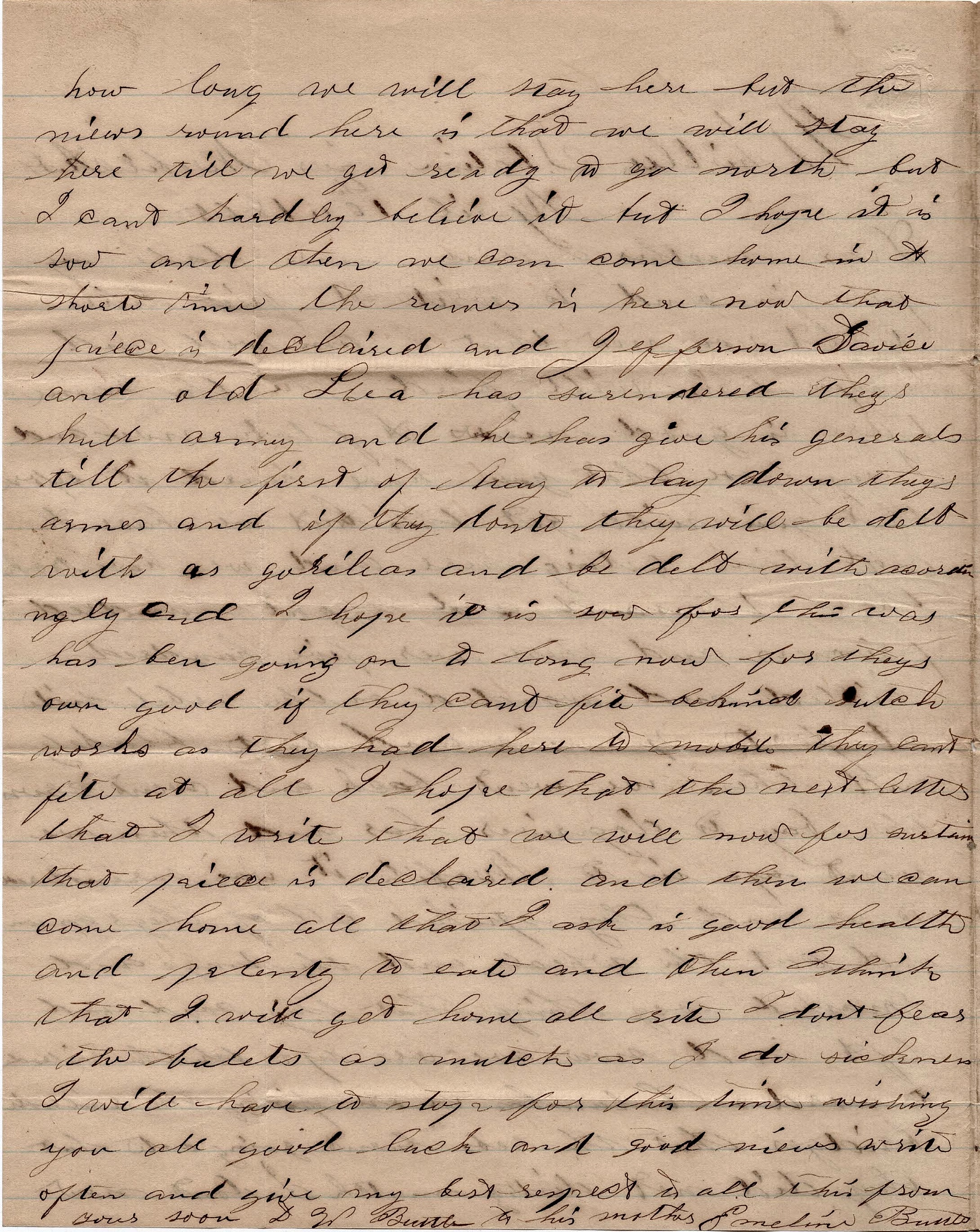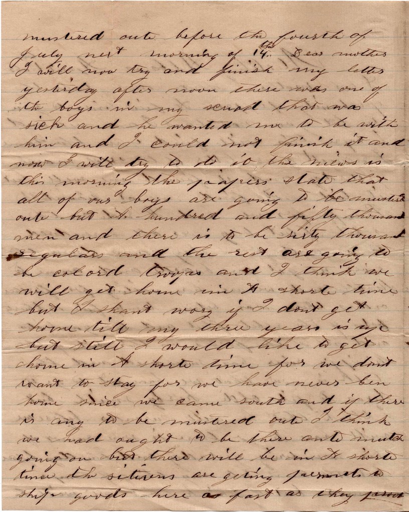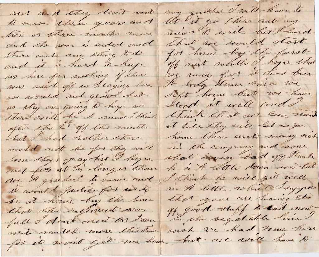I once more take my pen in hand to let you know that I am well and I hope this will find you the same. We are still in good spirits and are waiting for orders for us to go home but I don’t think that they will come very soon. But I hope it will come before long for after the 21st of this month, I think that there will be a good many that will refuse to do duty for they call their time out and I call mine out in four days more for I never took an oath to serve any longer than that and none of the rest and they don’t want to serve three years and two or three months more. And the war is ended and there ain’t anything to do and it is hard to keep us here for nothing. If there was use of us staying here, we would not growl but as they are going to keep us here, there will be muss, I think, after the 21st of this month. But I had rather there would not be for they will lose their pay. But I hope not for it is longer than we agreed to serve and it would be justice for us to be at home by the time that the regiment was full…