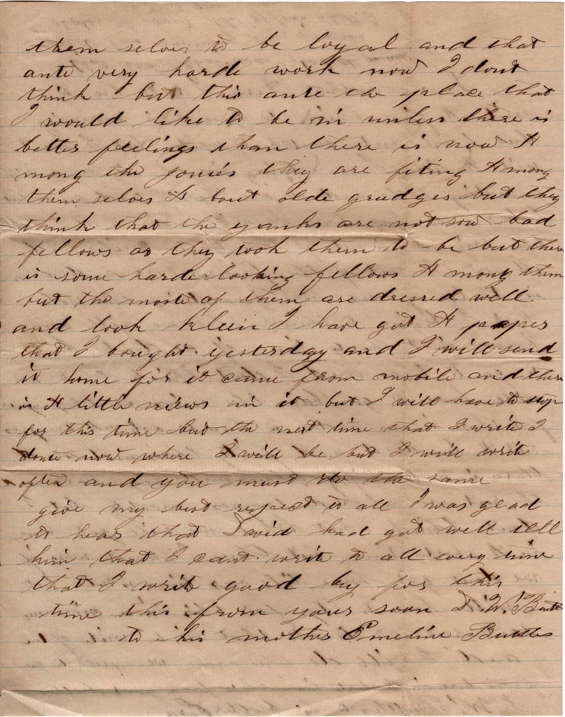 There ain’t anything going on but talk of going home and I think that we will. But the veterans, I think that they will have to stay for they will want them to garrison the towns till the South gets settled and that will be some time before they will quit quarreling among themselves. I don’t want to live in such a place as this is till they get some of the old grudges forgotten. I will have to stop for this time. I hope that I won’t have to write a great many more letters till i get home. Give my best to all. Write often and all the news. This from your son, — D. W. Buttles