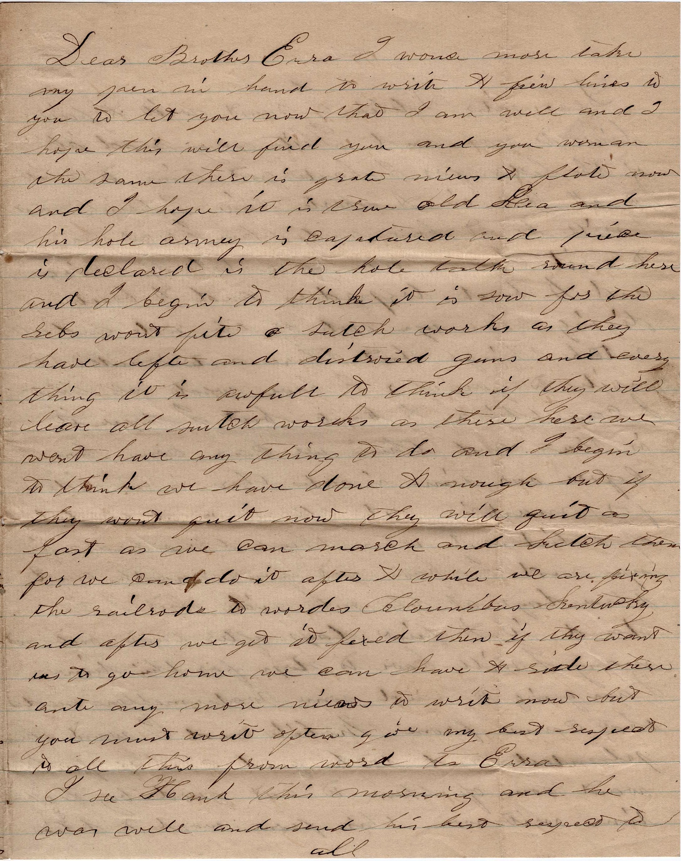 Dear brother Ezra, …There is great news afloat now and hope it is true. Old Lee and his whole army is captured and peace is declared is the whole talk round here and I begin to think it is so for the rebs won’t fight on such works as they have left and destroyed guns and everything. It is awful to think if they will leave all such works as these here. We won’t have anything to do and I begin to think we have done enough. But if they won’t quit now, they will quit as fast as we can march and catch them for we can do after a while.