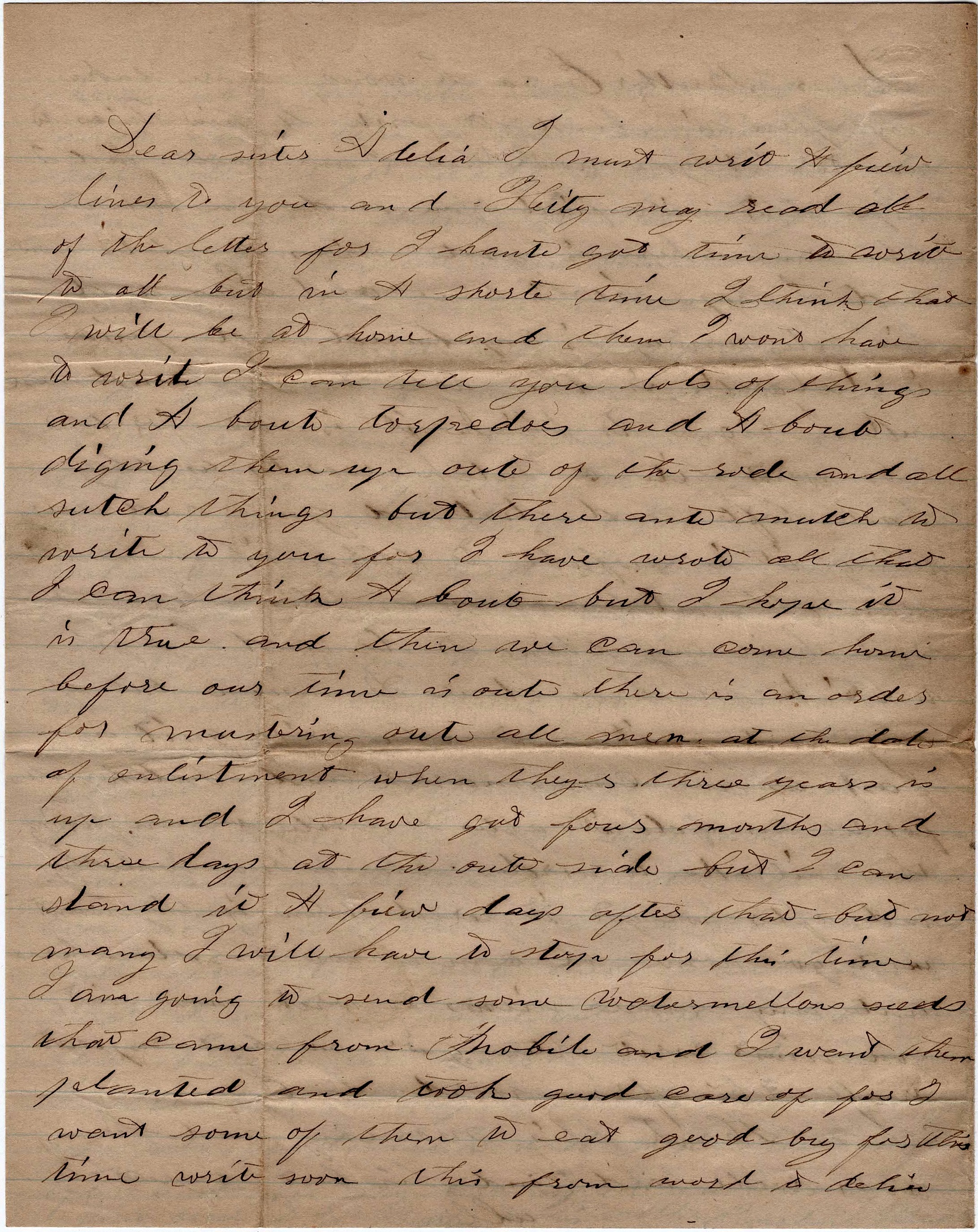 Dear sister Adelia, I can tell you lots of things and about torpedoes and about digging them up out of the road and all such things. But there ain’t much to write to you for I have wrote all that I can think of…I have four months and three days at the outside but I can stand it a few days after that…