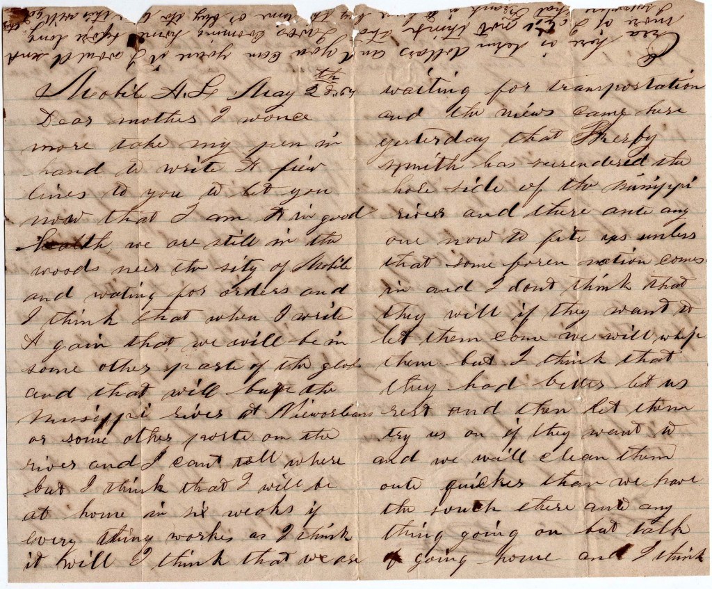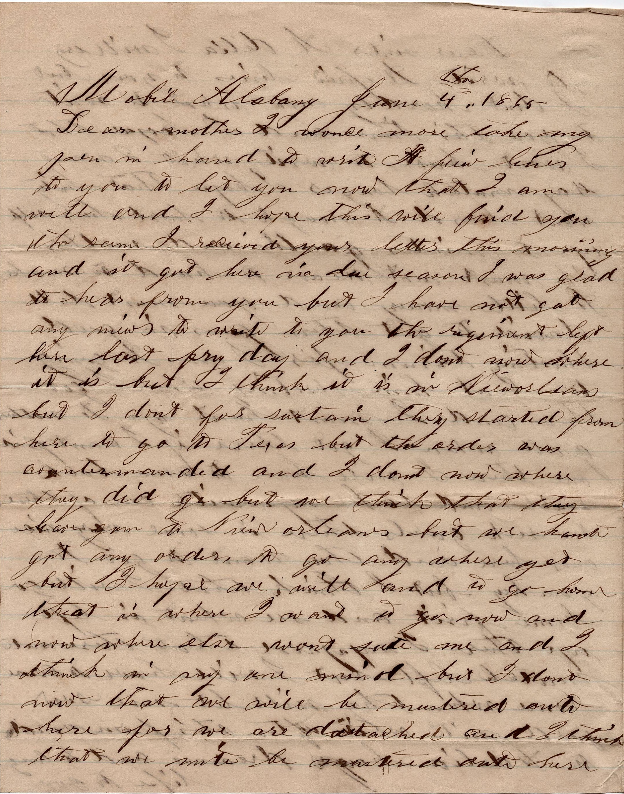 I once more take my pen in hand to write a few lines to you to let you know that I am in good health. We are still in the woods near the City of Mobile and waiting for orders and I think that when I write again, that we will be in some other part of the globe and that will be the Mississippi River at New Orleans or some other port on the river. I can’t tell where but I think that I will be at home in six weeks if everything works as I think it will. I think that we are waiting for transportation and the news came here yesterday that Kirby Smith has surrendered the whole side of the Mississippi River and there ain’t anyone now to fight us unless that some foreign nation comes in and I don’t think that they will. If they want to, let them, but I think that they had better let us rest and then let them try us on if they want to and we will clean them out quicker than we have the South.