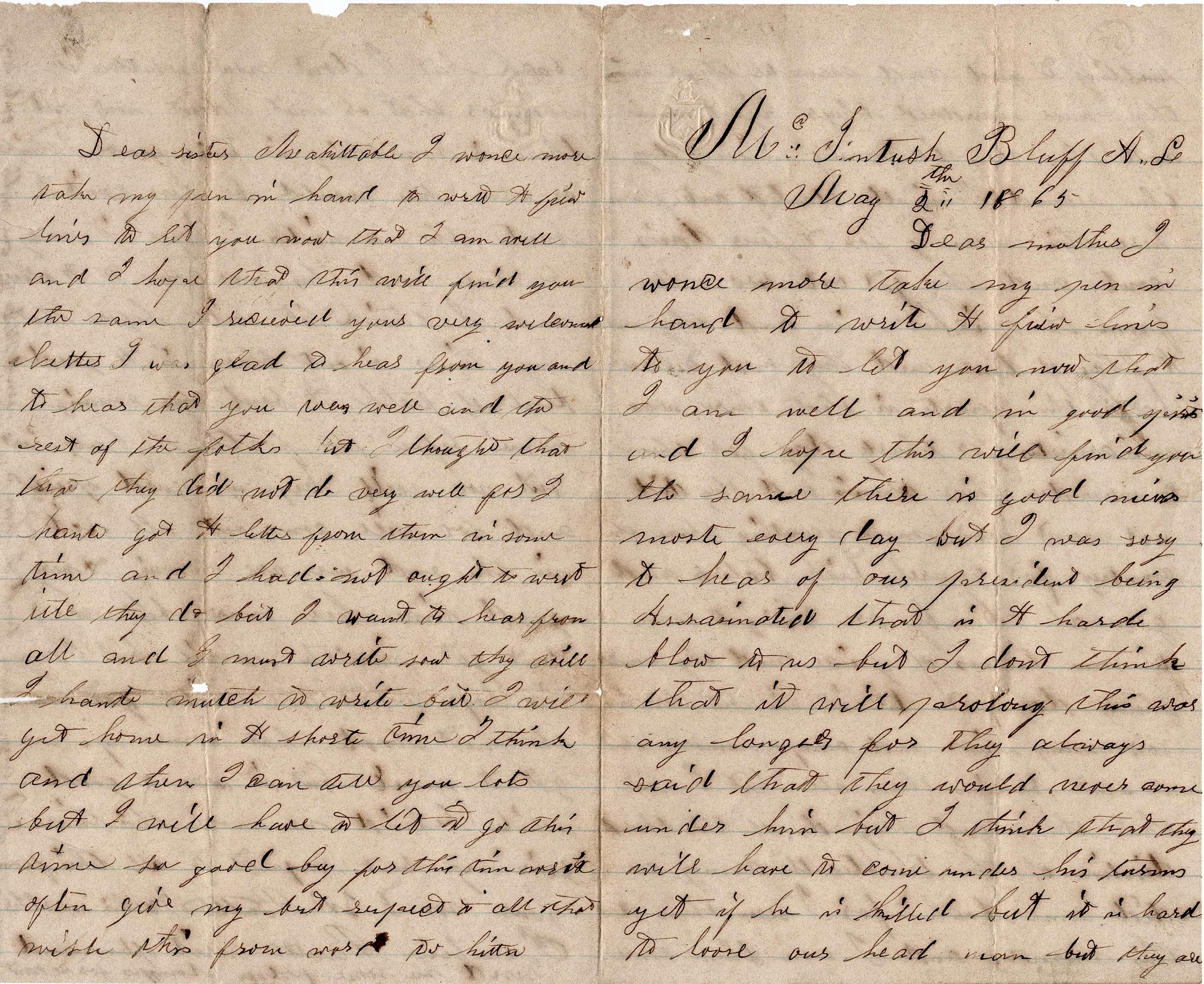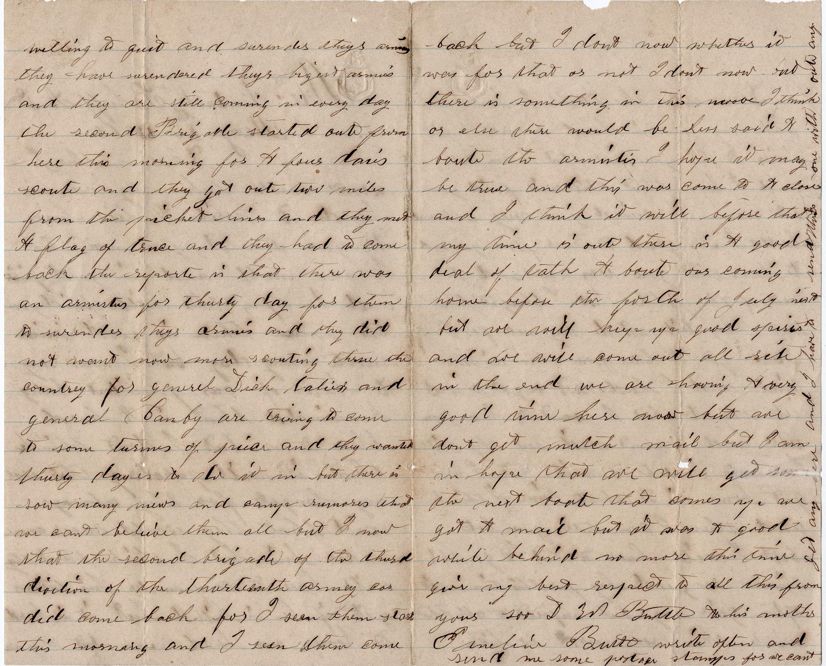 There is good news most every day but I was sorry to hear of our President being assassinated. This is a hard blow to us but I don’t think that it will prolong this war any longer for they always said that they would never come under him. But I think that they will have to come under his terms yet [even] if he is killed. But it is hard to lose our head man. But they are willing to quit and surrender their army. They have surrendered their biggest armies and they are still coming in every day. The Second Brigade started out from here this morning for a four days’s scout and they got out two miles from the picket lines and they met a flag of truce and they had to come back. The report is that there was an armistice for thirty days for them to surrender their armies and they did not want no more scouting through the country for General Dick Taylor and Gen. Canby are trying to come to some terms of peace and they wanted thirty days to do it in. But there is so many views and camp rumors that we can’t believe them all. But I know that the 2nd Brigade of the 3rd Division of the 13th Army Corps did come back for I seen them start this morning and I seen them come back. But I don’t know whether it was for that or not. I don’t know but there is something in this move, I think, or else there would be less said. About the armistice, I hope it may be true and this war come to a close and I think it will be before that my time is out. There is a good deal of talk about our coming home before the 4th of July next but we will keep up good spirits and we will come out all right in the end.