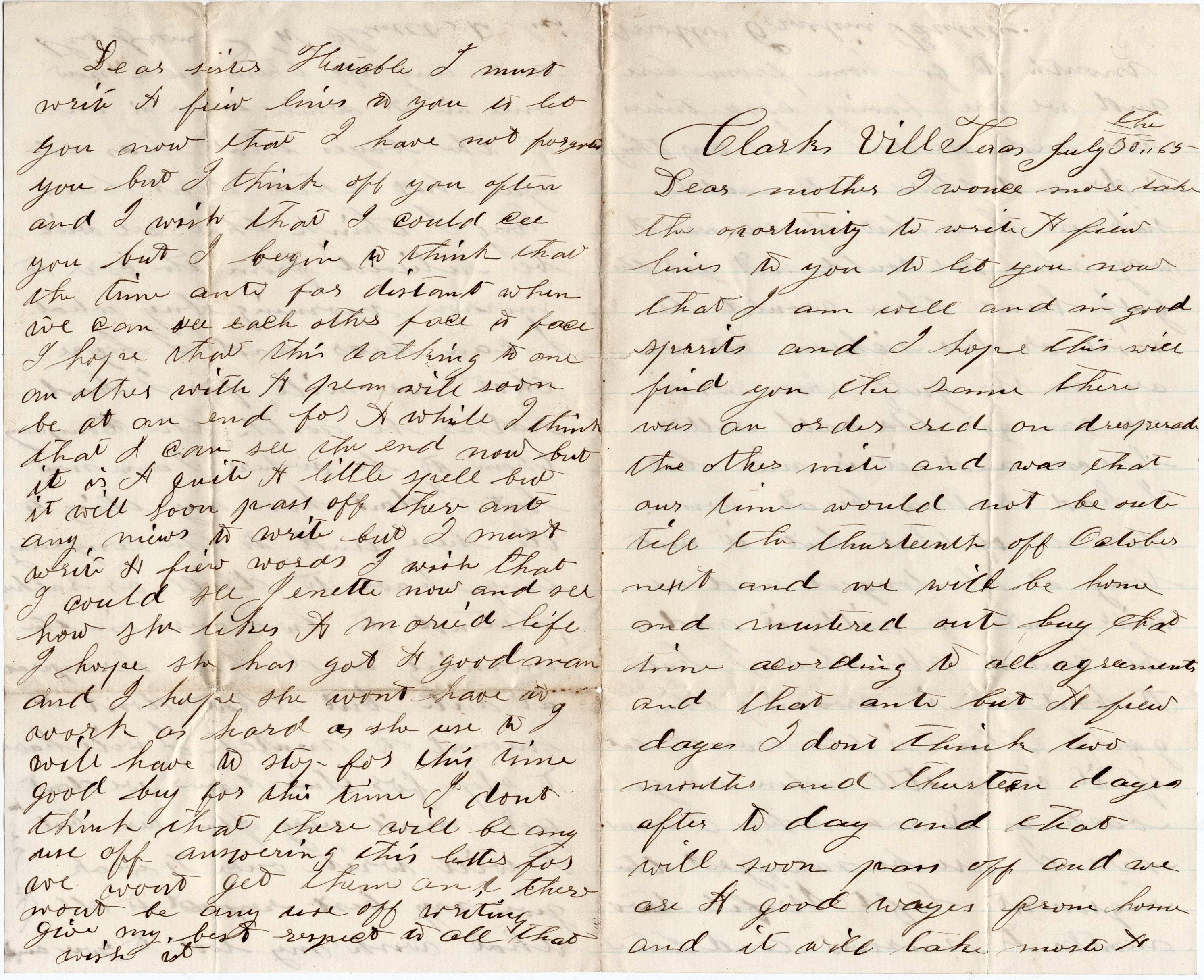 The regiment left here last Friday and I don’t know where it is but I think it is in New Orleans. They started from here to go to Texas but the order was countermanded and I don’t know where they did go. But we think that they have gone to New Orleans. We han’t got any orders to go anywhere yet but O hope we will and to go home. That is where I want to go now. Nowhere else will won’t suit me and I think in my mind but I don’t know that we will be mustered out here for we are detached and I think that we might be mustered out here as well as to go to our regiments. If we don’t have to go to Texas, we might as well go home as well as to stay around here and do nothing.