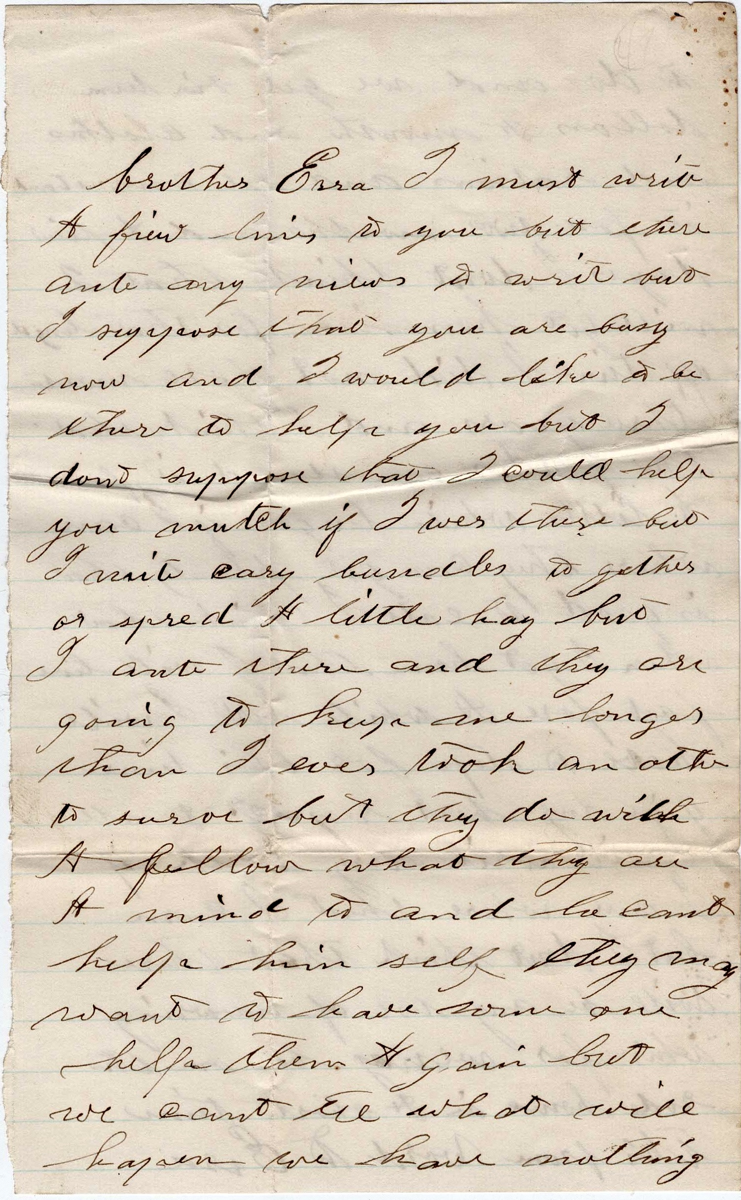 You wanted me to write whether that five dollars at Dan’s was mine or Dan’s. It is mine and Dan has got a book that tells which is his and which is mine, if he han’t lost it. And then you can tell what I got and if Dan wants it, let him have it and put it on the note. I think there will be enough to pay the note up. There ain’t but fifty dollars to pay on the note. I hope that I can come home in the spring and see to my own business but do the best you can. No more at this time. Write often, — Ezra Buttles