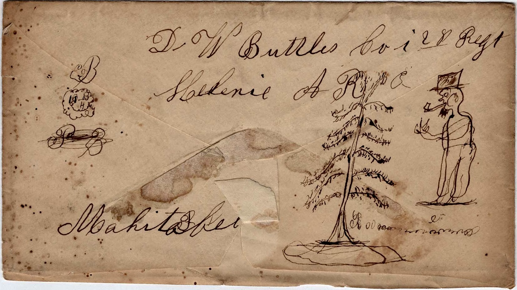 Adelia, how do you like to go to school? And I would like ot know who is teaching your school. Give my best respects to her and the rest of the folks and tell them we are happy. But when we get whipped, we don’t like it. But we han’t been in any battles yet. But they come very near it. Charley Storms, he says that the 22nd [Wisconsin] boys is exchanged and coming back but I hope they will not get taken again. No more this time. Write often. This from your brother, — D. W. Buttles