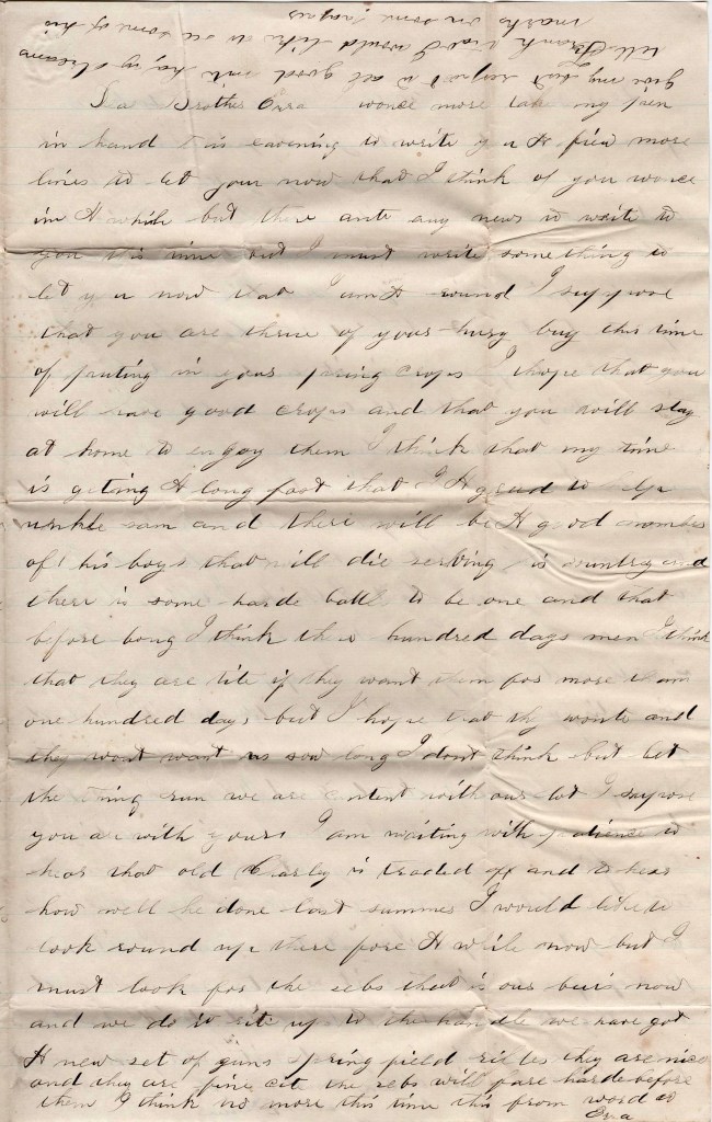 Dear brother, I once more try to write you a few more lines to you. Have you got that house yet? and got any grain in it yet? I want you to have breakfast ready when I come for we are coming in a short time, I think. Richmond has fallen at last and they have evacuated Haine’s Bluff and gone to some more better place. But they will get routed out. I don’t care where they go for we are going to whip them now we have commenced. This is the first time that they been in earnest, I think. Don’t get discouraged for there is a better time coming. Go sound the bugles. There will be some noise here tomorrow, you can bet. I wish you could be here a little while and you could see something.