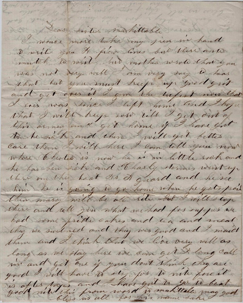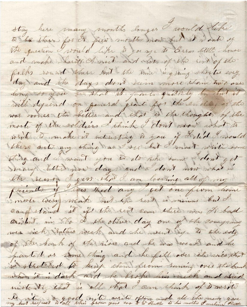 I now take my pen in hand to let you know how I am getting along. I am getting better than I was. I went out doors yesterday for the first time in twenty-five days. I have been so lame that I could not walk for I was so lame but I am getting better now I ain’t getting discouraged at all. I hope that you ain’t worrying about me for I have good care and I feel as if it was all for the best. I hope that these few lines will find you all in good health. There ain’t much news here. I should like to hear from you oftener that we do. I would write oftener than I do if I had time. Will try to write to you once in a week but we can’t—we have so much to do, But I han’t been so I could write lately. I got seven letters in two days. That was when we got back from Saint Charles. We have been knocked round every day most but we will stay here some time I guess.