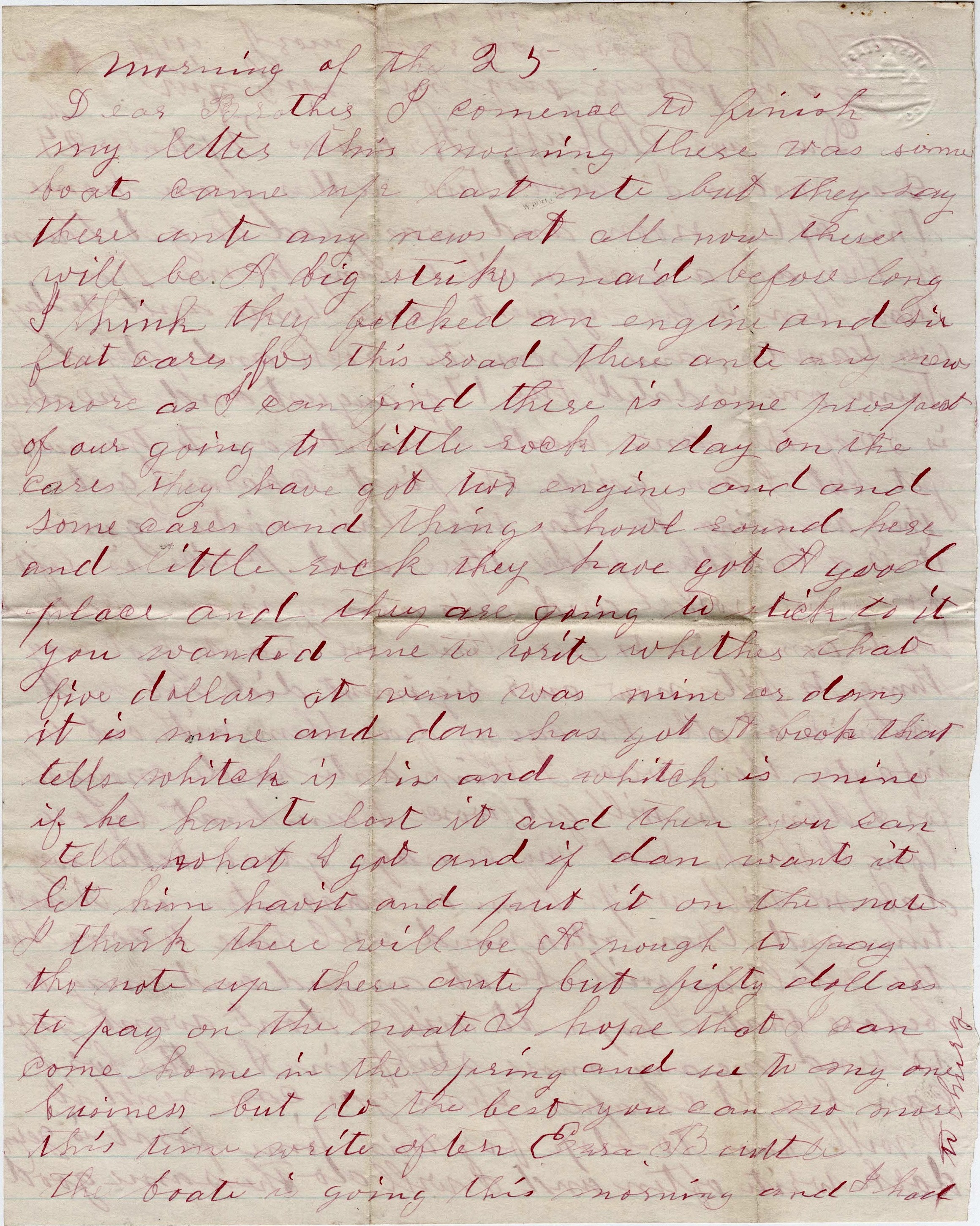 Morning of the 25th. Dear brother, I commence to finish my letter this morning. There was some boats came up last night but they say there ain’t any news at all now. There will be a big strike made before long, I think, They fetched an engine and six flat cars for this road. There ain’t any news more as I can find. There is some prospect of our going to Little Rock today on the cars. They have got two engines and some cars and things howl around here and Little Rock. They have got a good place and they are going to stick to it.