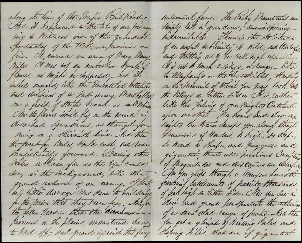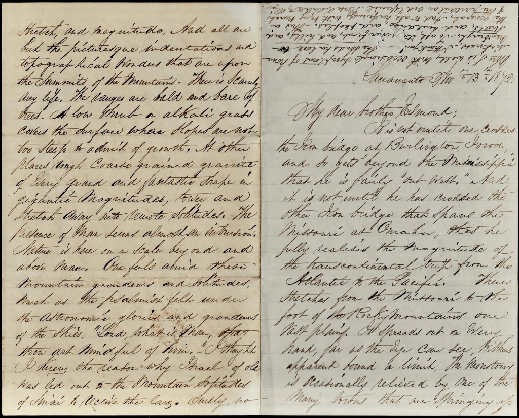 In this incredible 1872 letter, Charles informs his brother Esmond of his safe arrival in Sacramento, California, and shares his observations of the journey which was made on the “Pacific Railroad” which was completed just three years earlier in 1869. Charles made the journey to accept an appointment as the pastor of the Westminster Presbyterian Church in Sacramento. He held the position there for two years and then returned East to accept the pastorate at the Main Street Methodist Episcopal Church in Nashua, New Hampshire. After two years there, he then requested to be transferred back to the Southern California Conference in March 1876 and he was pastor of Pasadena’s Methodist Church until he retired. He died in Alhambra, California, in December 1887, where he had settled prior to 1880.