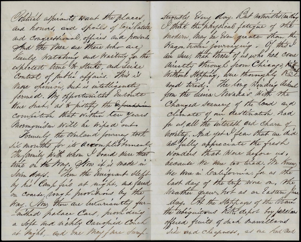We saw but little of Utah. The train made a halt of an hour [stop] at Ogden. Many passengers took the cars for Salt Lake City. We saw some of the outlying settlements of Mormondom; saw the dwellings with extensions added, as we fancied to furnish home accommodations to the followers of this accursed Yankeeised Mahomedanism. They are—apart form their polygamous abomination—a quiet, industrious, and thrifty people. But their peculiar system is doomed. The miners want the wealth of their mountains. And they will have it. Political aspirants want the places and honors and spoils of legislative and congressional offices and powers. And the men are there who are keenly watching and waiting for the expected time to strike and seize control of public affairs. This is mere opinion, but it is intelligently formed. My opportunities en route were such as to justify the conviction that within ten years Mormonism will be wiped out.