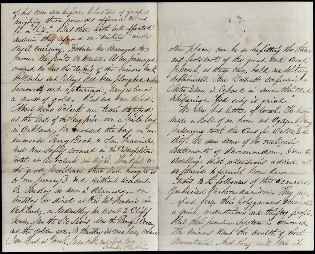 But we were tired. About nine o’clock our train stopped at the end of the long pier—over a mile ling—in Oakland. We crossed the bay on an immense ferry boat to San Francisco and were safely roomed in the Cosmopolitan Hotel at ten o’clock at night, thankful to the good Providence that had brought us to our journey’s end without accident. On Sunday we were in Alameda. On Tuesday we dined at Rev. Mr. Fraser’s in Oakland. On Wednesday we went to Cliff House, 1 saw the sea lions, saw the Pacific Ocean, and the Golden Gate. On Thursday we came here where I am hard at work. We are well and send love, — Charles Shelling