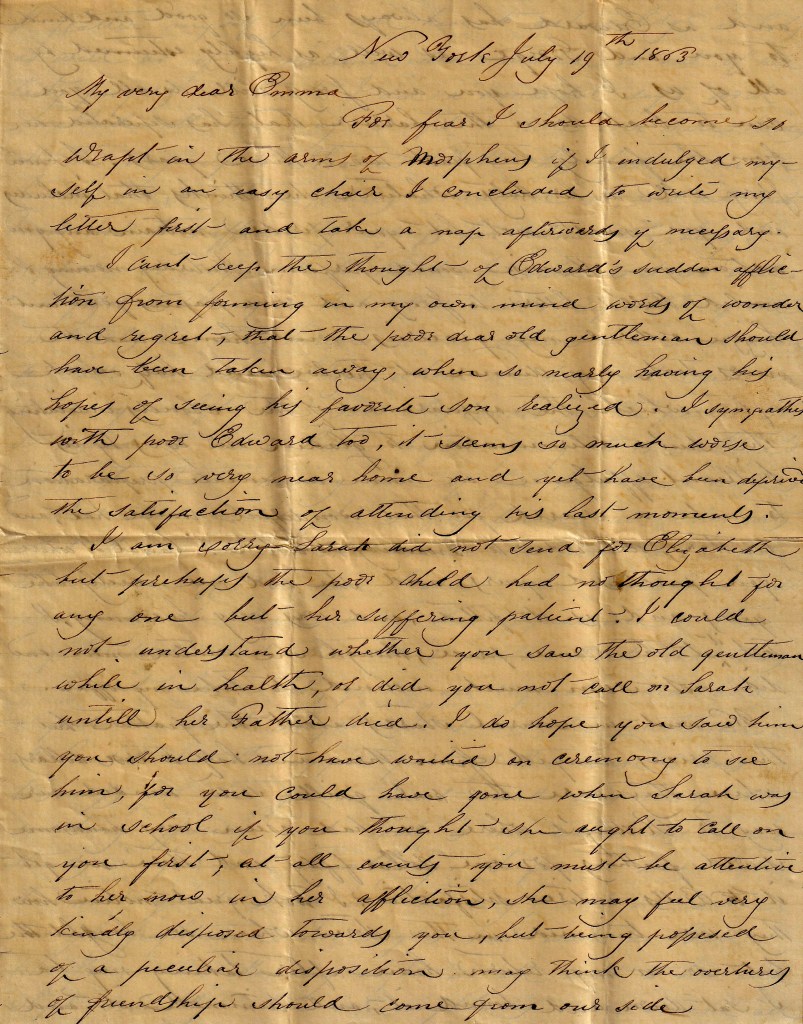 For fear I should become so wrapped in the arms of Morpheus if I indulged myself in an easy chair, I concluded to write my letter first and take a nap afterwards if necessary. I can’t keep the thought of Edward’s sudden affliction from forming in my own mind words of wonder and regret, that the poor old gentleman should have been taken away, when so nearly having his hopes of seeing his favorite son realized. I sympathize with poor Edward too, it seems so much worse to be so very near home and yet have been deprived the satisfaction of attending his last moments.