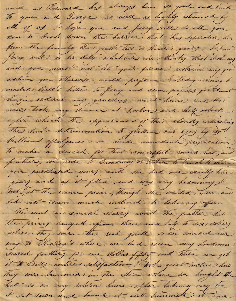 Yesterday morning I mailed Bell’s letter to Josey and some papers for Aunt Lizzie, ordered my groceries, went home, read the news, took my dinner at twelve and half o’clock, after which the appearances of the clouds indicating the suns determination to gladded our eyes by its brilliant effulgence. We made immediate preparation to make a search for that wonderful round hat and feather. We rode to Broadway, or rather to Canal Street where you purchased yours and she had one exactly like yours and as it fitted and was very becoming, I took it at the same price, though she wanted more and did not seem much inclined to take my offer. We went in several stores. About the feather hat, the prices ranged from three and a half to six dollars where they were the real quill so we winded our way to Ridley’s where we had seen very handsome sewed feathers for one dollar fifty and there we got it to Bell’s entire satisfaction. I took great notice how they were trimmed in the store where we bought the hat so on my return home, after taking my tea, I sat down and bound it, and trimmed it and I flatter myself, you will have to acknowledge it looks as well as if a milliner had turned it out of her tasty fingers. I think I did a wonderful day’s work. Walked all the way except to ride over there, besides all the way up to Sloane. Bell has had it on her head two or three times to admire it and did not know how to sufficiently express her admiration, being I suppose so surprised to think I could do it so well.