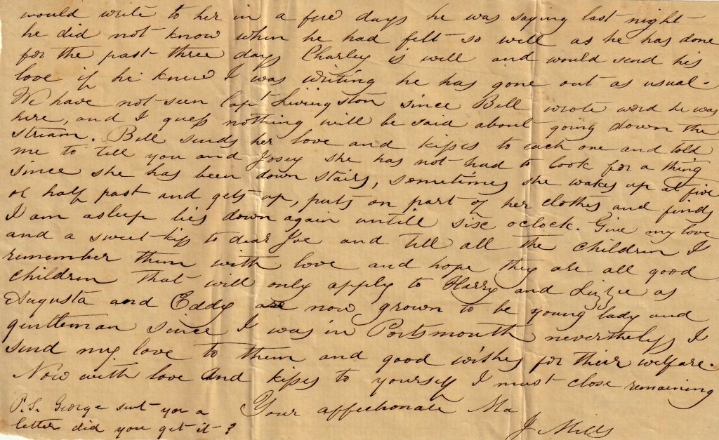 George [said he] would write to her in a few days….Charley is well and would send his love if he knew I was writing. He has gone out as usual. We have not seen Capt. Livingston since Bell wrote word he was here and I guess nothing will be said about going down the stream. Bell sends her love and kisses to each one and told me to tell you and Josey she has not had to wake up at five or half past and gets up, puts on part of her clothes, and finds I am asleep, lies down again until six o’clock. Give my love and a sweet kiss to dear Joe and tell all the children I remember them with love and hope they re all good children. That will only apply to Harry and Lizzy as Augusta and Eddy are now grown to be young lady and gentleman since I was in Portsmouth. Nevertheless I send my love to them and good wishes for their welfare.