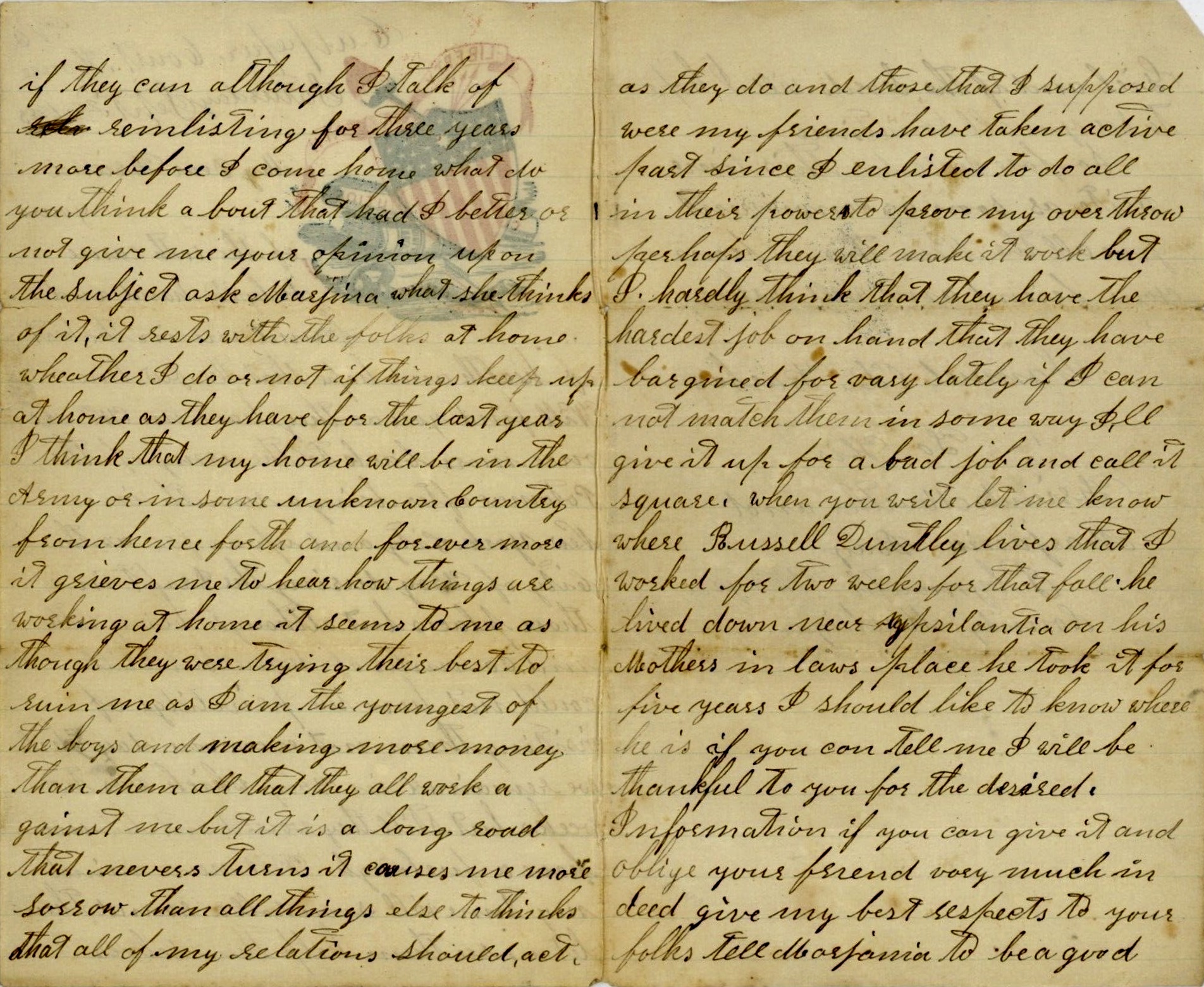 It rests with the folks at home whether I do or not. If things keep up at home as they have for the last year, I think that my home will be in the Army or in some unknown country from henceforth and forever more. It grieves me to hear how things are working at home. It seems to me as though they were trying their best to ruin me as I am the youngest of the boys and making more money that them all that they all work against me. But it is a long road that never turns. It causes me more sorrow than all things else to think that all of my relations should act as they do and those that I supposed were my friends have taken active part since I enlisted to do all in their power to prove my overthrow. Perhaps they will make it work, but I hardly think that they have the hardest job on hand that they have bargained, for very lately, if I cannot match them in some way, I’ll give it up for a bad job and call it square.