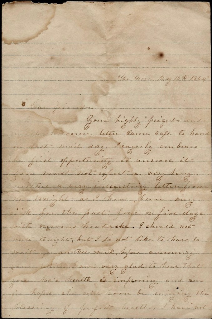The letter was datelined from “The Grove” on 16 May 1864. The Grove was probably the name of Carrie’s homestead which I presume was in North Carolina and possibly even in Guilford county where the Woollen family lived in Greensboro.