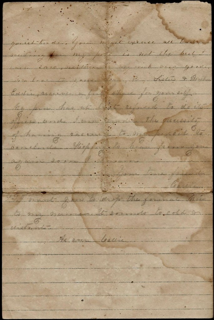 We would be glad to send you a box of provisions if we were certain you would get it safely. Next time you write, let us know what you want and what you are in need of and if it is in our power to send it, you shall have it. I must stop writing for I have not anything more that would interest you.