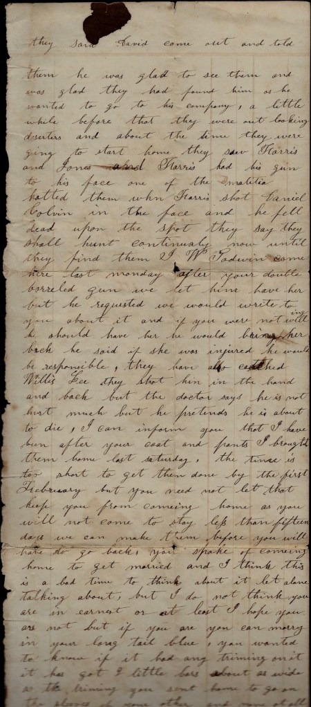The Cumberland Militia keeps very busy now looking up deserters. They have catched D[avid] J. Godwin 4, Blackmon and Branch. They dug them out of a cave under old Blackmon’s Stable and they are all lodged in Fayetteville jail at this time. They said David come out and told them he was glad to see them and was glad they had found him as he wanted to go to his company. A little while before that, they were out looking [for] deserters and about the time they were going to start home, they saw Harris and Jones. Harris had his gun to his face. One of the militia halted them when Harris shot Daniel Colvin in the face and he fell dead upon the spot. 5 They say they shall hunt continuously now until they find them.