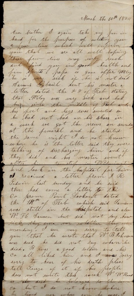I again take my pen in hand for the purpose of writing you a few lines which will inform you that we are all well, hoping these few lines may early reach and find you in good health and fine spirits. Papa is gone after Wiley. He is very sick if he is not dead. Dawson’s Gabriel sent his master a letter dated the 28th of February stating that Wiley [Dawson] 1 was very sick and had been since the middle of February and his feet and legs was swelled & he had not had on his shoes in a week. We got the news on Sunday at the funeral and he started and he started the same night. I do not know where he is. The letter said they were talking of discharging him and if they did and his master went after him, to stop in Wilmington and look in the hospital for him.